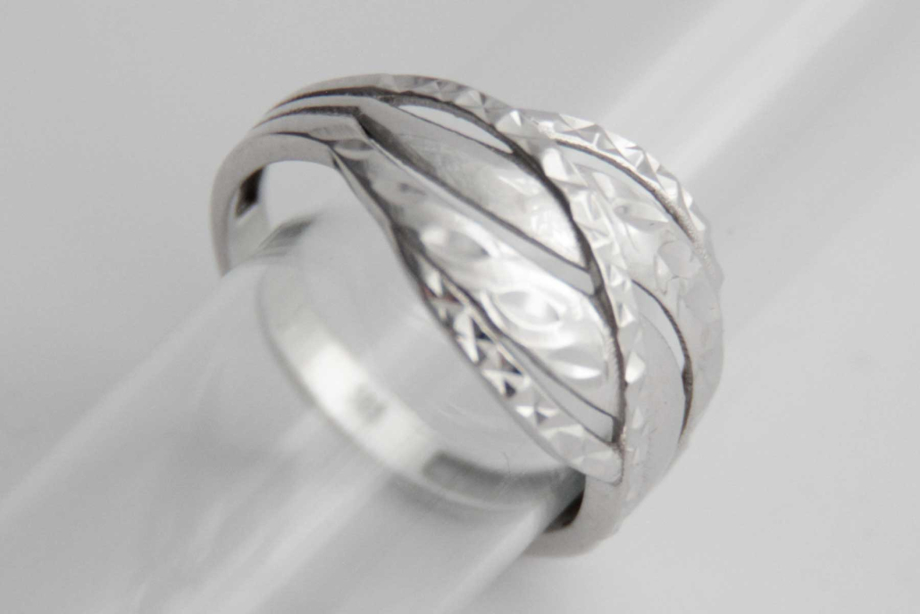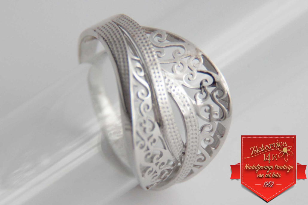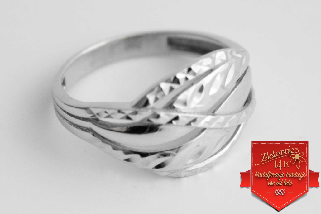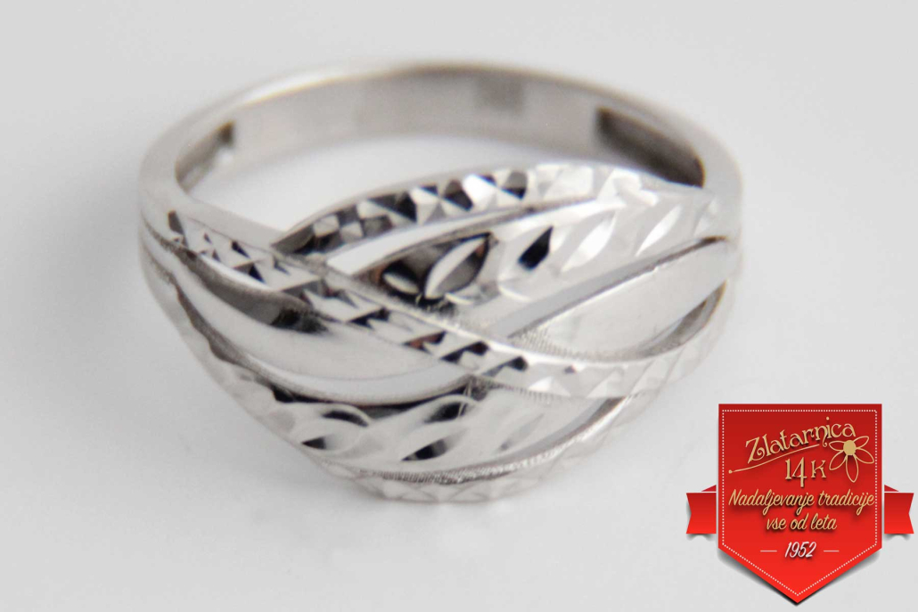 Širok ženski prstan iz belega zlata, sestavljen iz prepletenih izbočenih linij z okrasno gravuro, ki dajejo prstanu videz vkovanih kamnov.