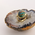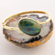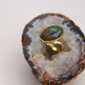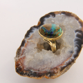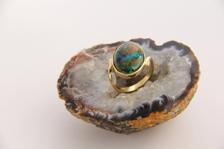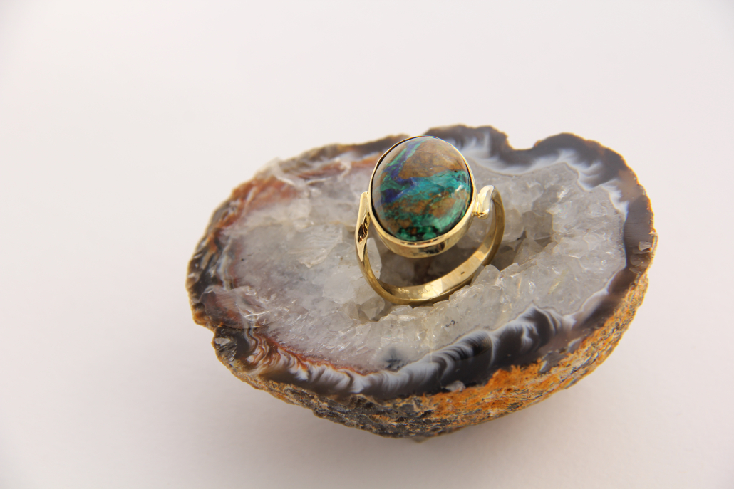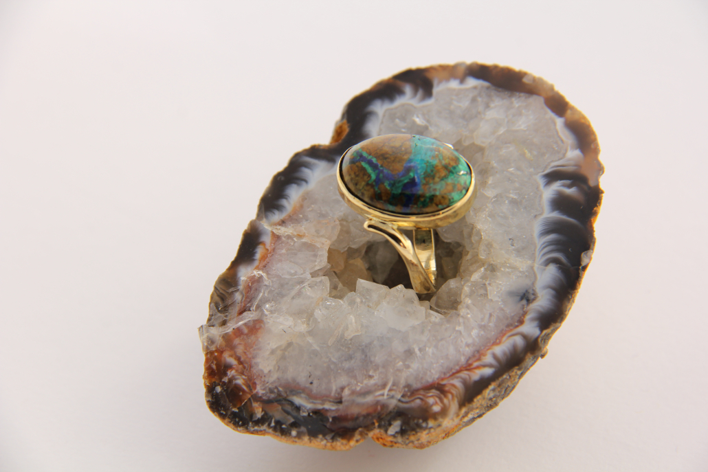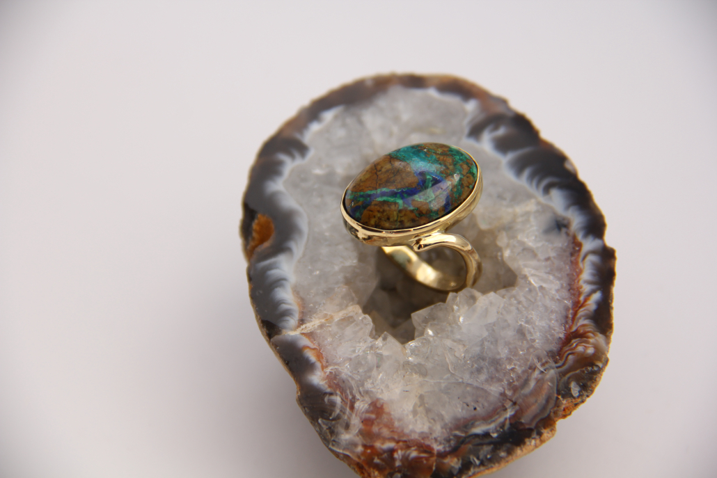 Unikatni prstan v obliki gladkega obroča, ravnega profila z vstavljenim Azurit malahitom v osrednjem delu.