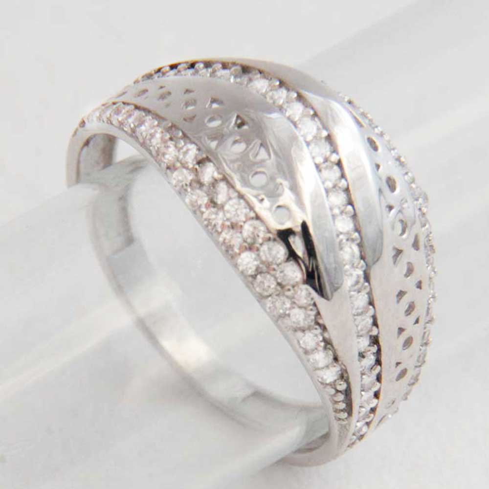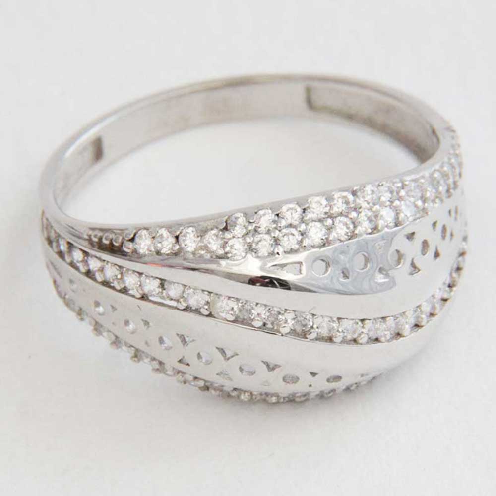 Eleganten prstan iz belega zlata z zrezljanim luknjičastim vzorcem, ki ga deli linija s vkovanimi cirkoni.