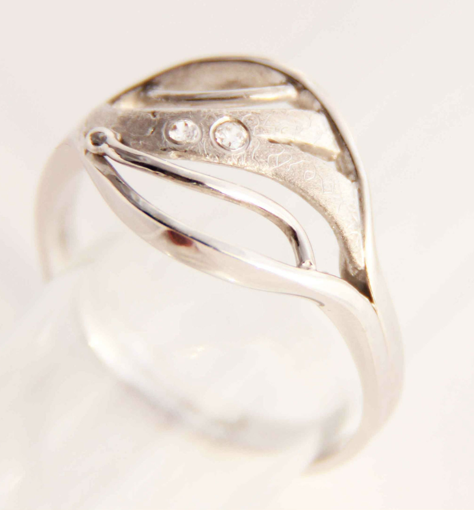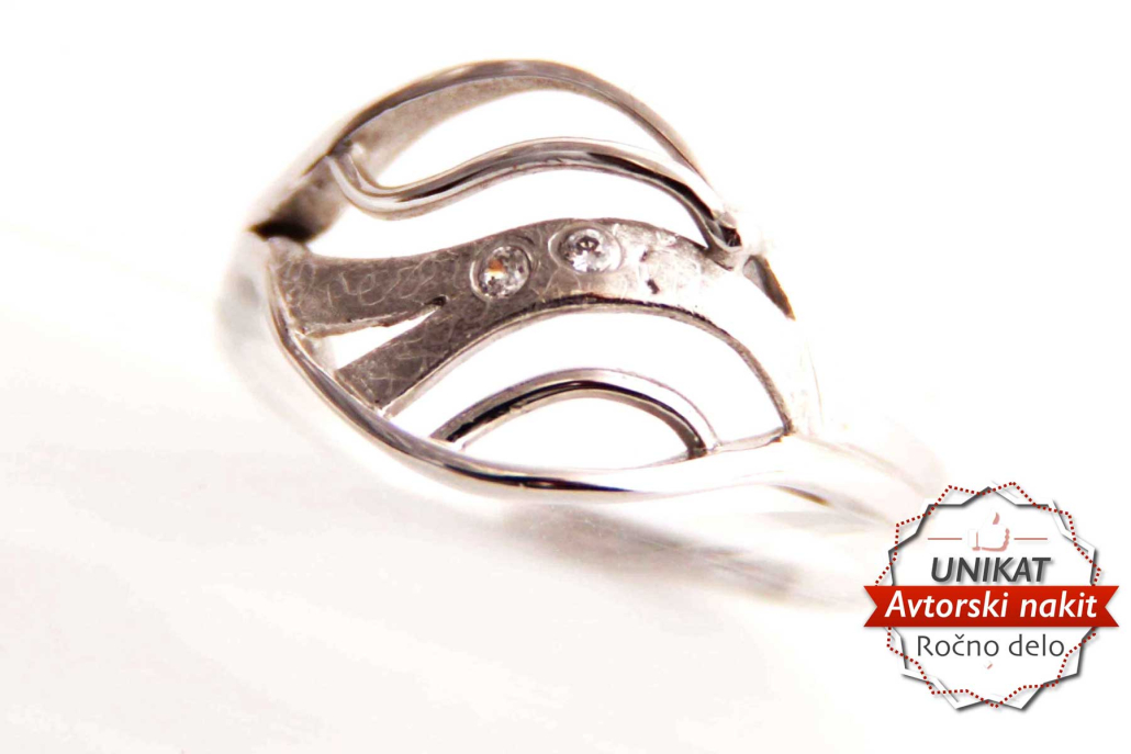 Unikaten in ročno izdelan prstan iz belega zlata in dveh cirkononov.