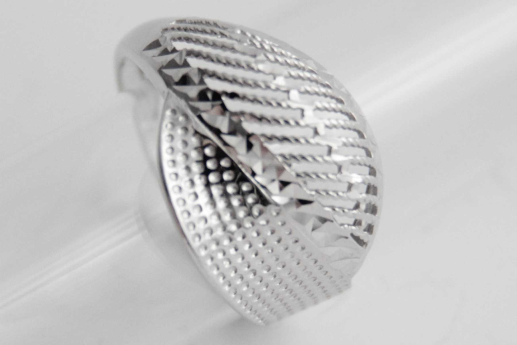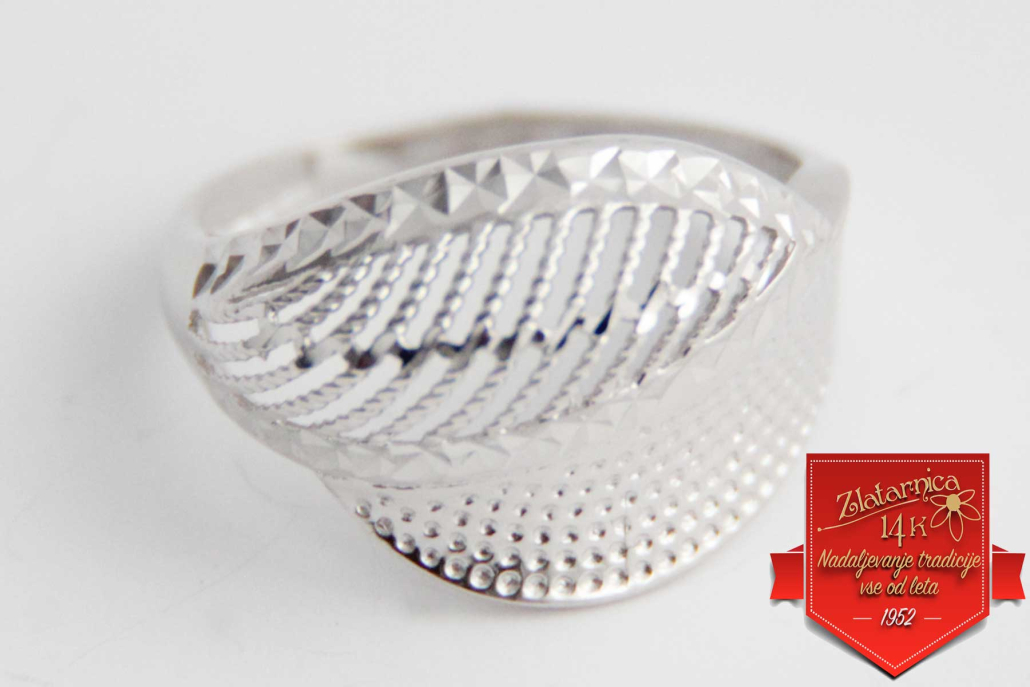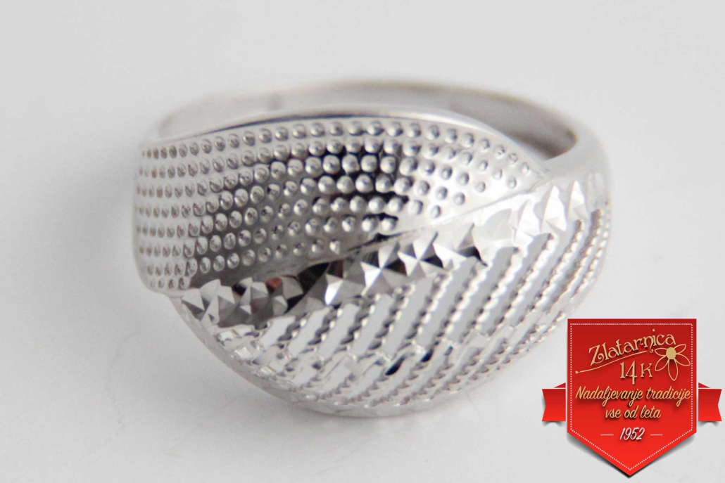 Ženski prstan iz belega zlata, sestavljen iz linije v obliki izbočene mreže in konkavne linije z okrasno gravuro, ki daje prstanu videz vkovanih kamnov.