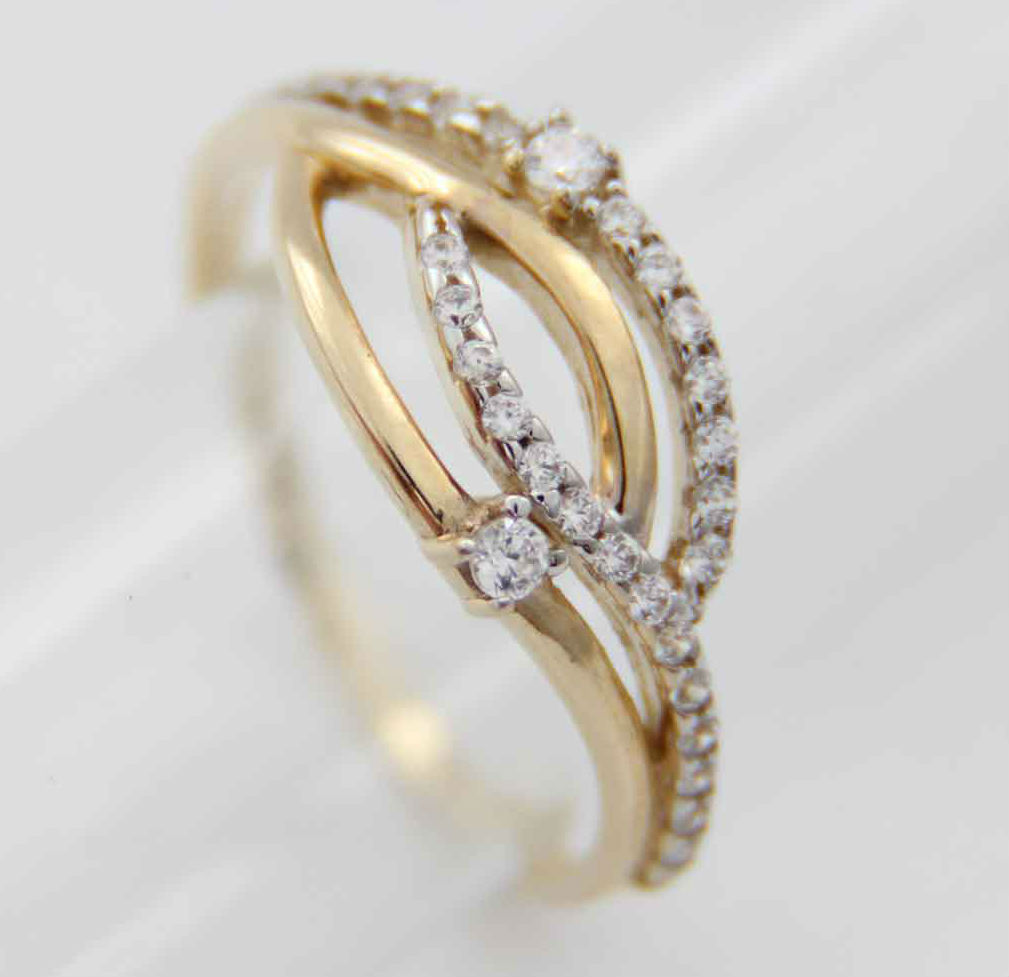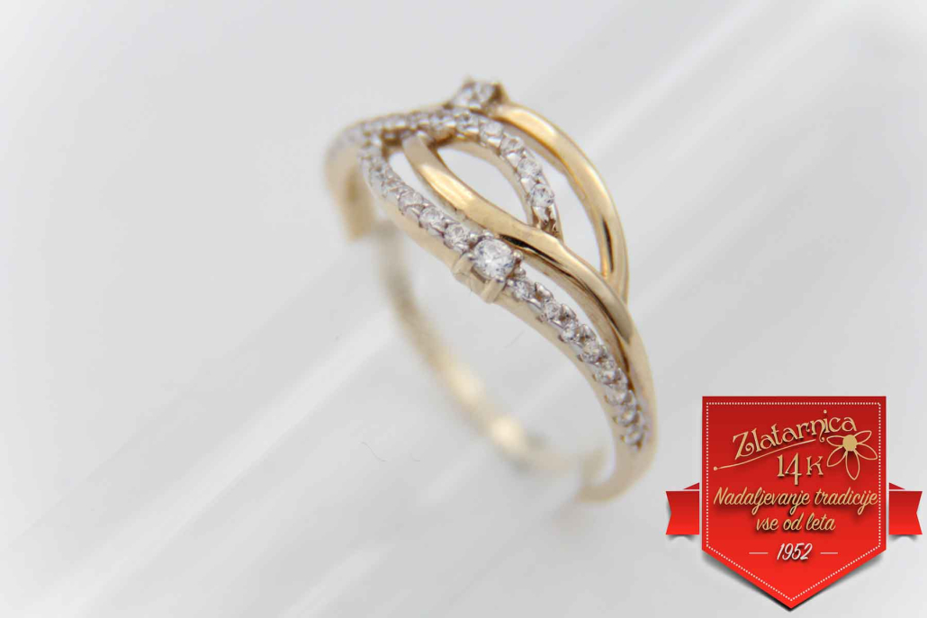 Prstan iz ozkih pasov iz rumenega zlata, ki so prepleteni s pasovi iz belega zlata, v katerih so vkovani cirkoni.