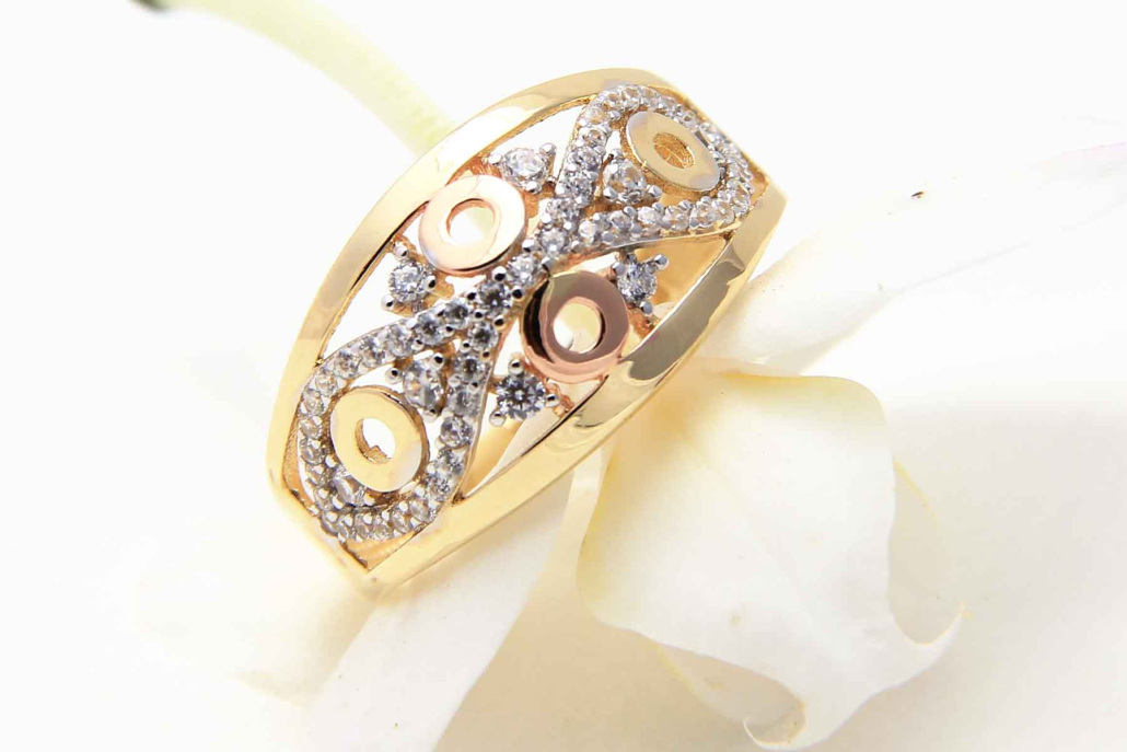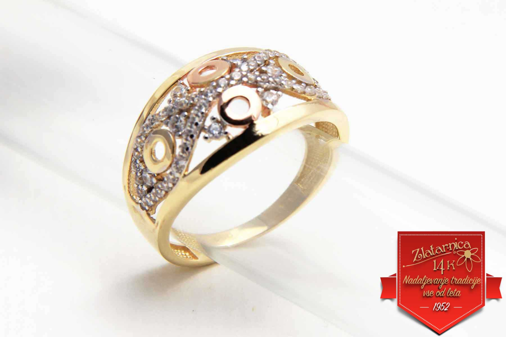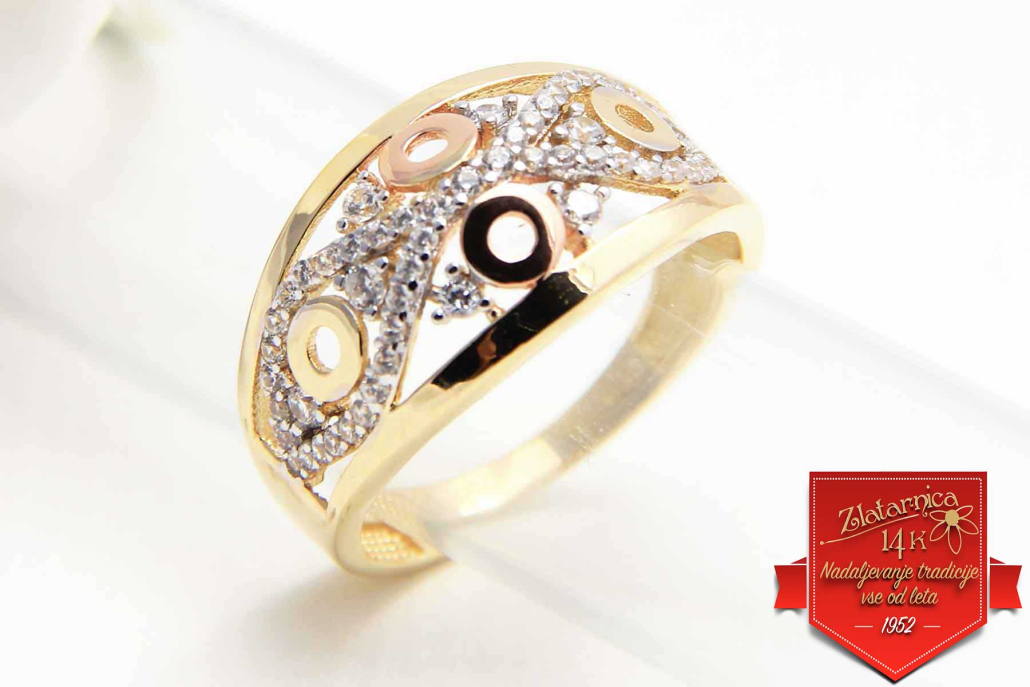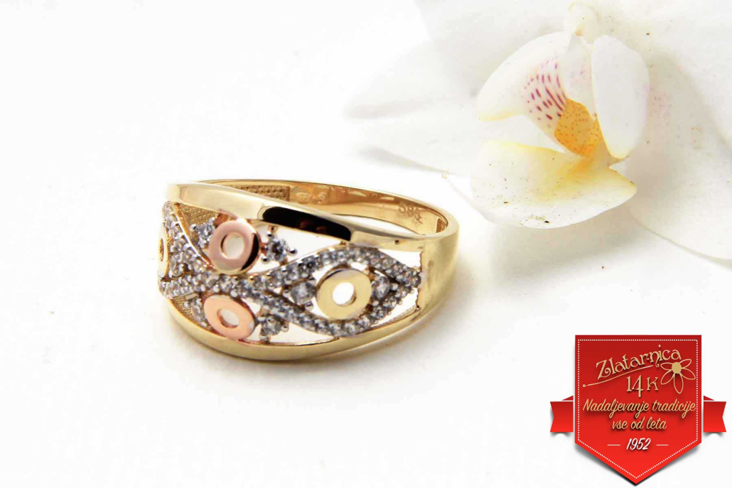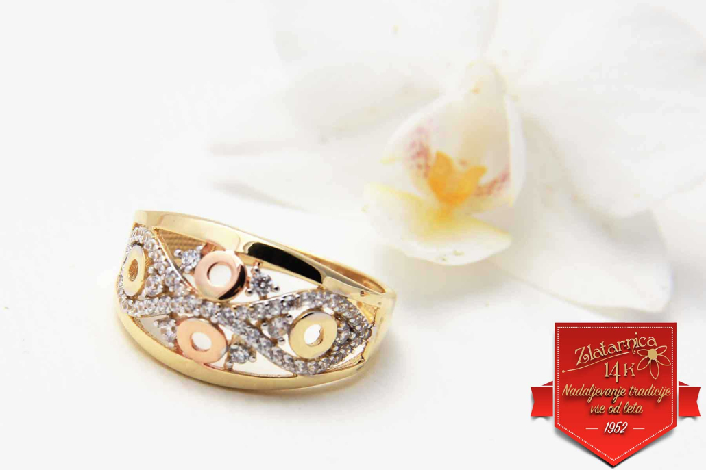 Čudovit prstan ki je povezan z osmico iz belega zlata s cirkoni, krogcev iz rose zlata in gladke osnovne linije iz rumenega zlata.