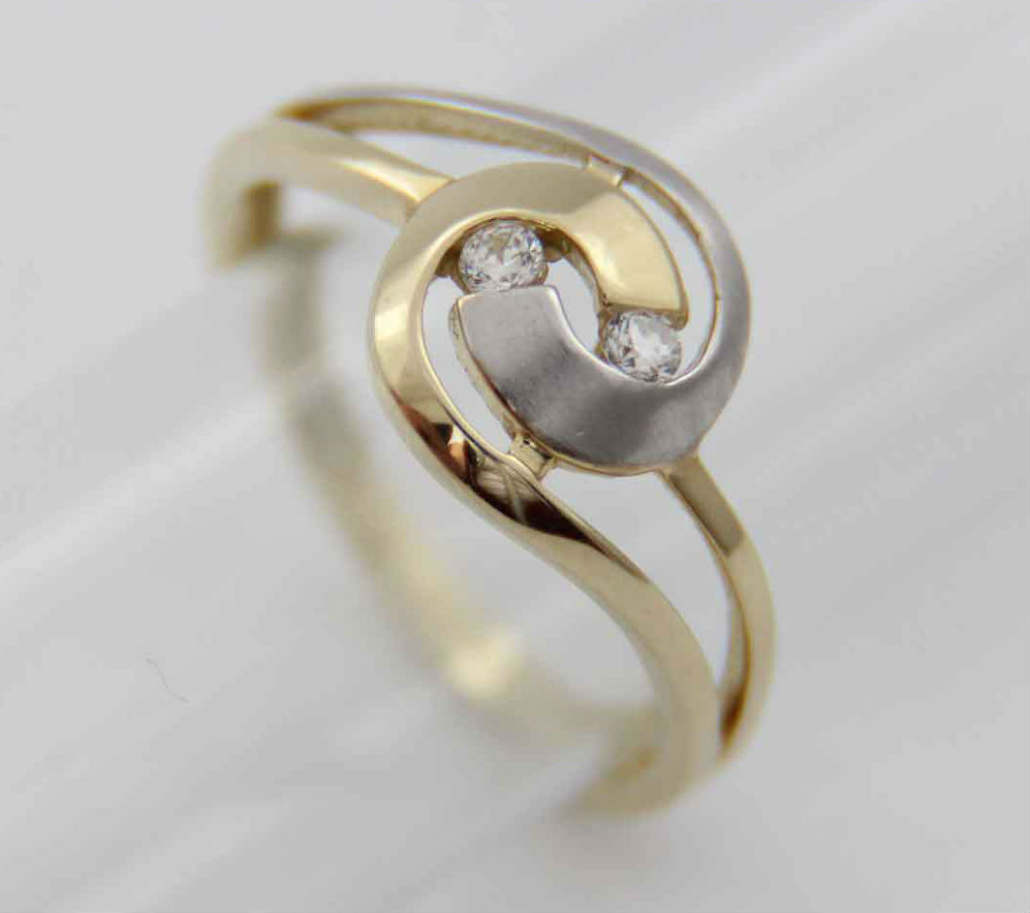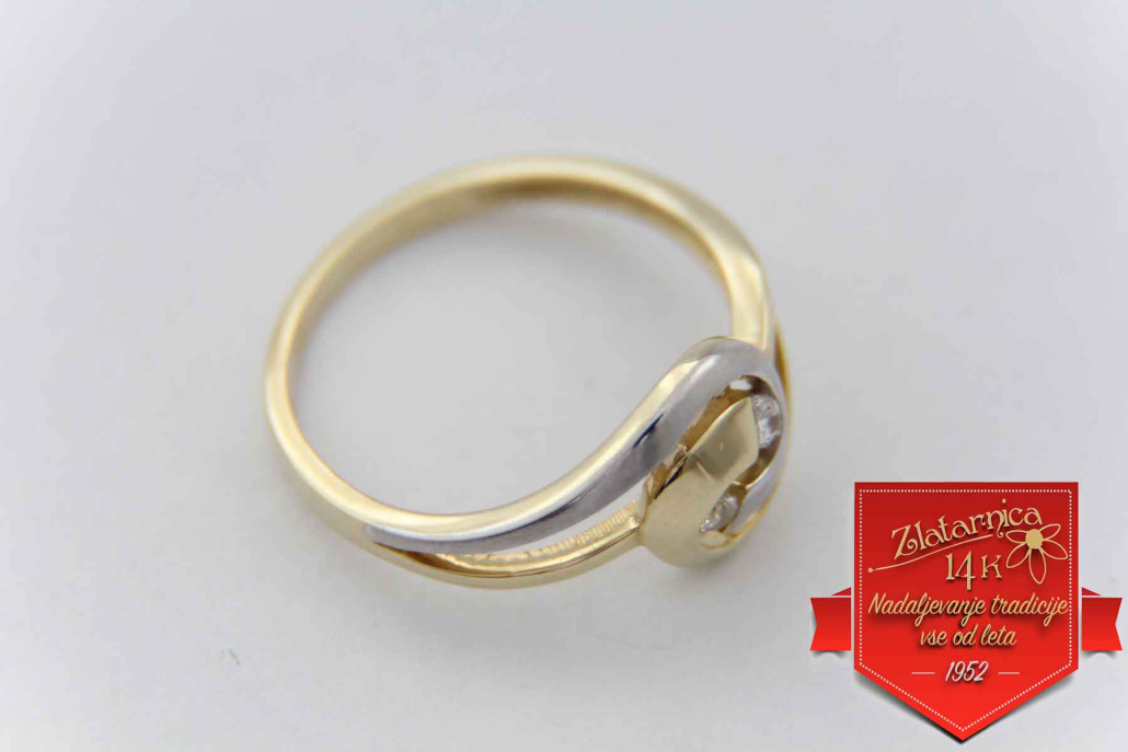 Prstan iz ozkih pasov iz rumenega in belega zlata, ki se proti sredini prstana razširijo v krog.