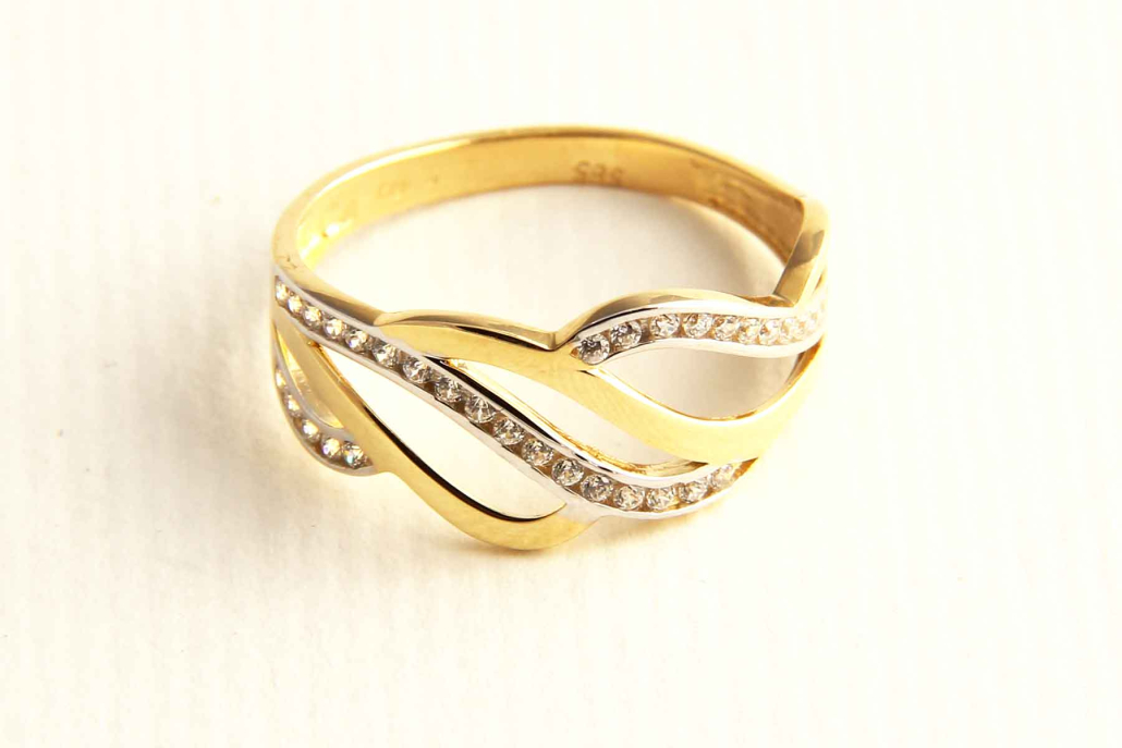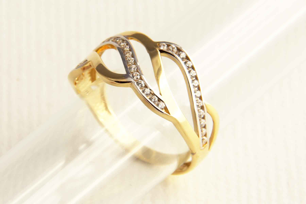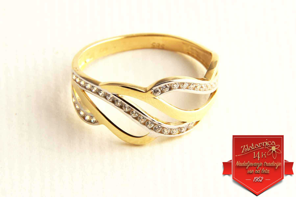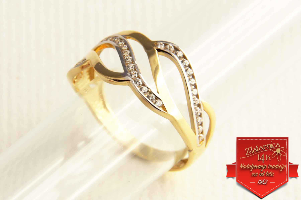 Široki prstan iz rumenega zlata, na katerem se prepleta več pasov. V vsakem drugem pasu so vkovani cirkoni.