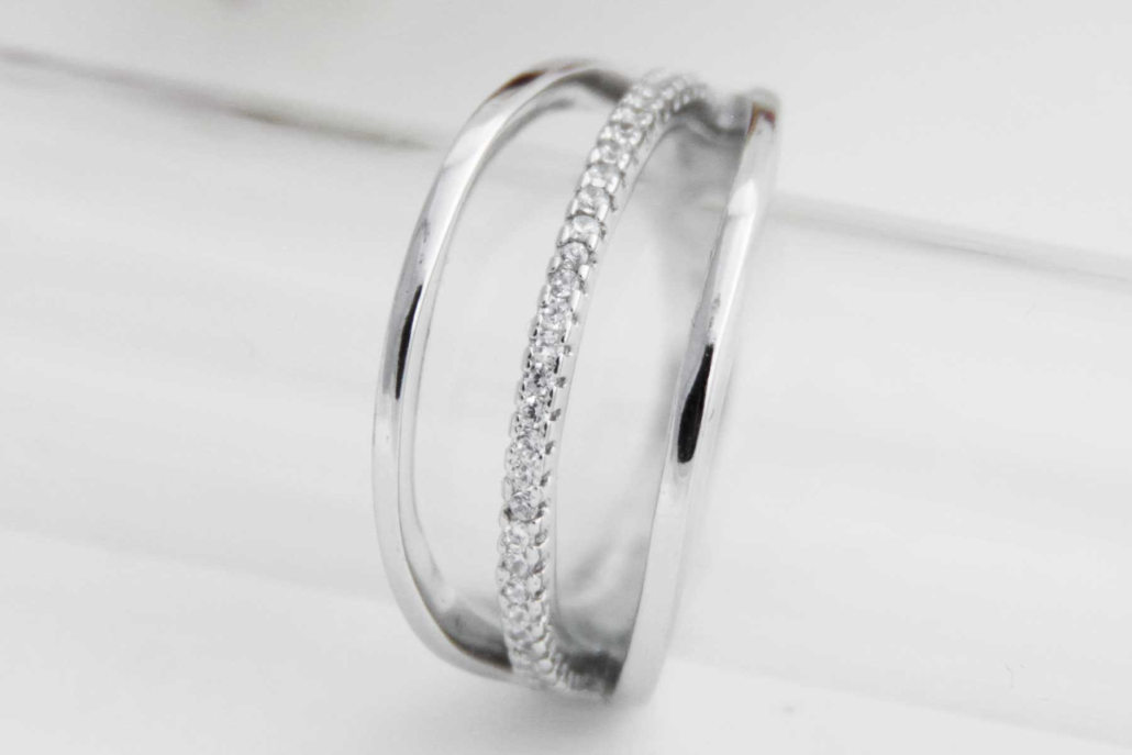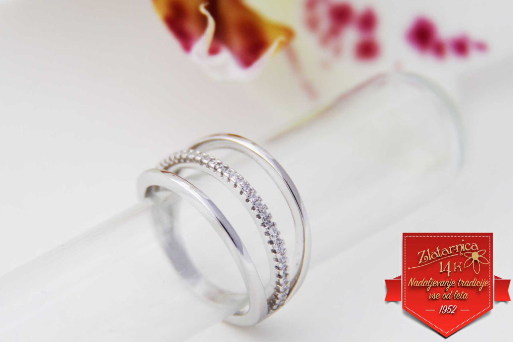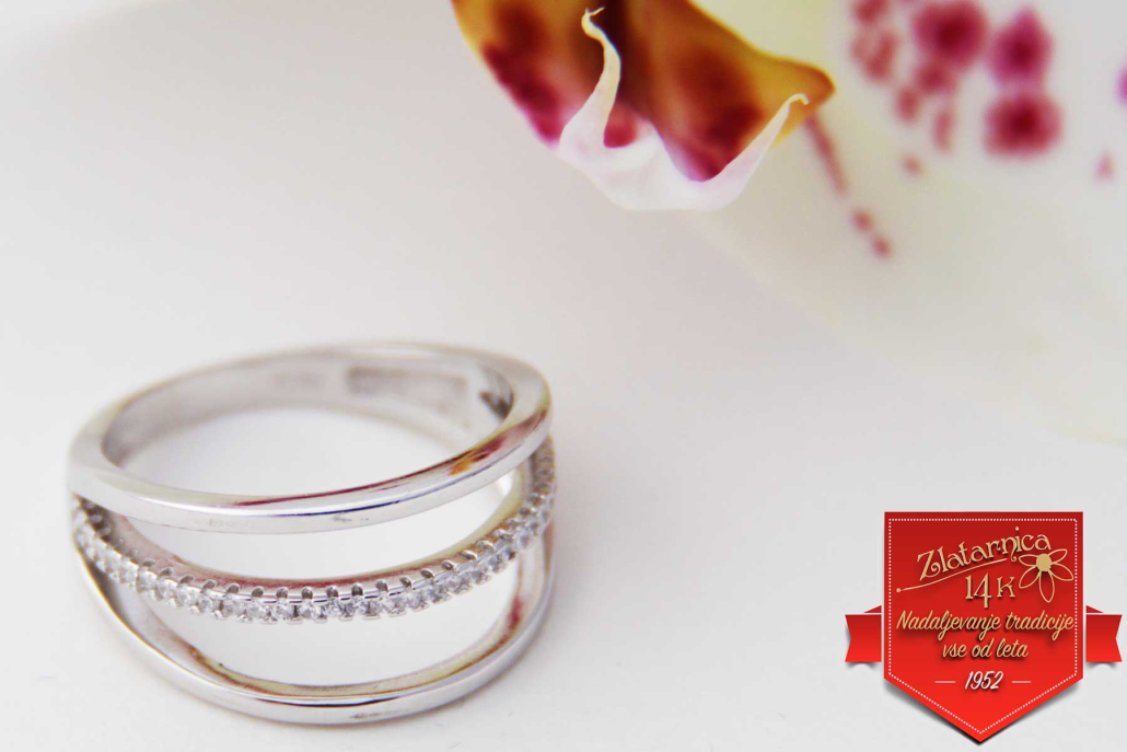 Elegantno razširjen srebrni prstan s cirkoni v srednji liniji.