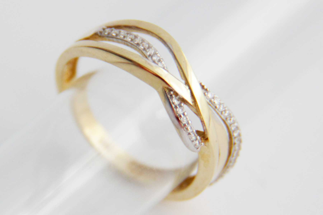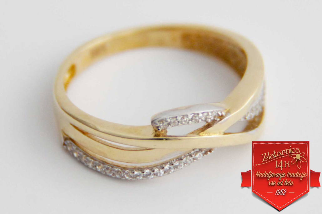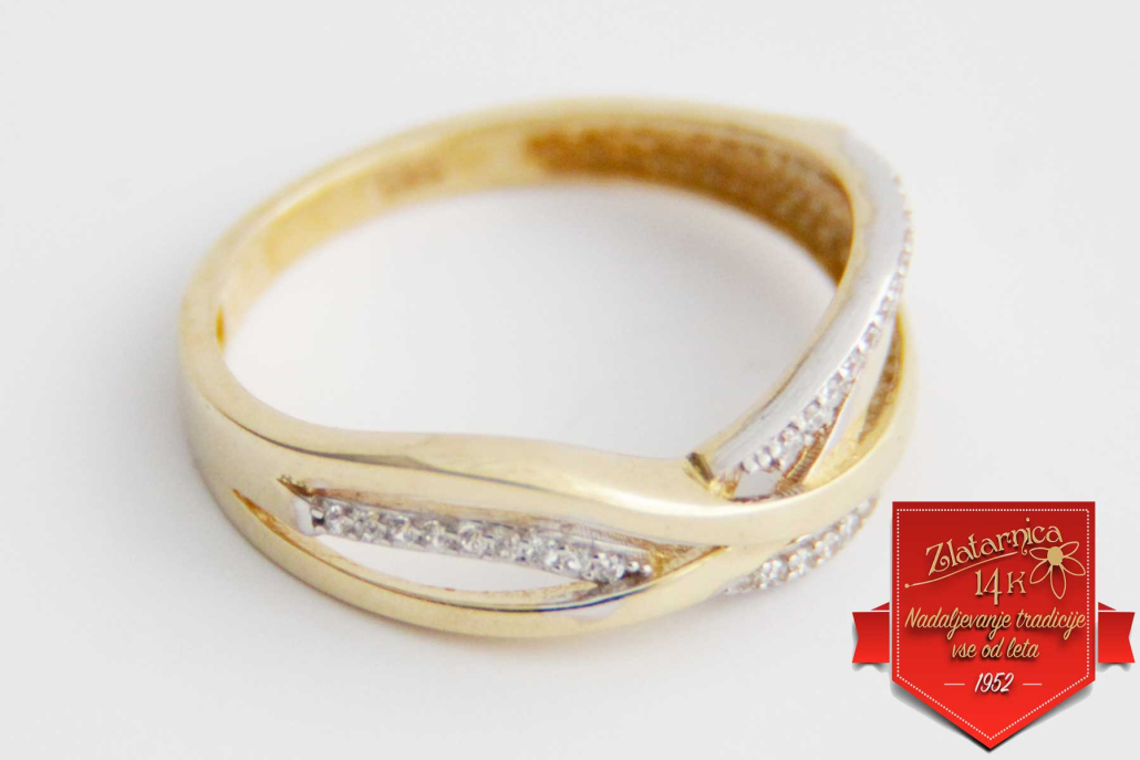 Zanimiv ženski prstan iz belega in rumenega zlata ponavljajočih se poliranih linij s vkovanimi cirkoni.