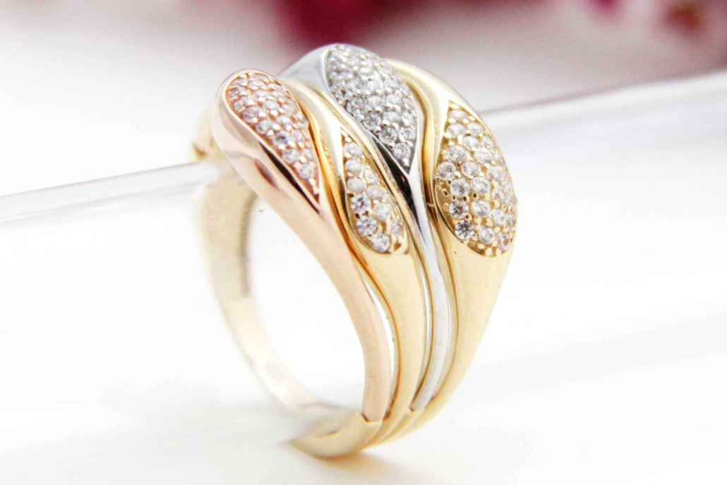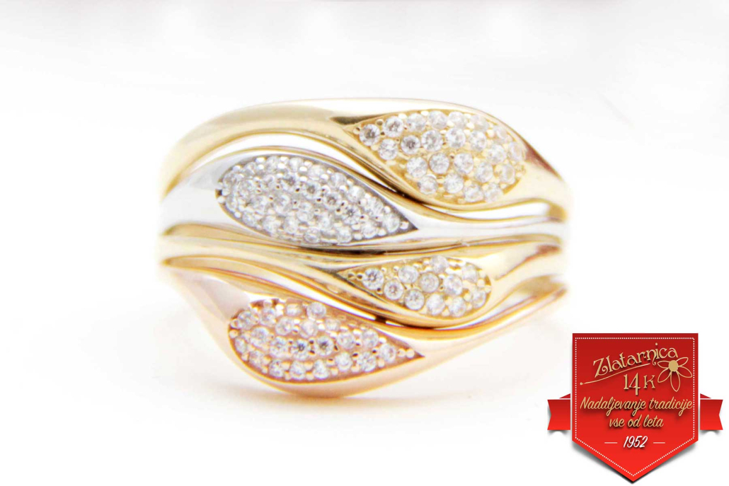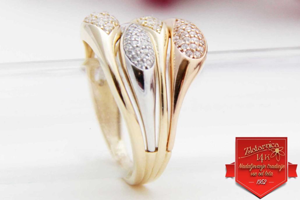 Čudovit prstan v obliki štirih linij na katerih se prelivajo gladke linije rumenega, rdečega in belega zlata s vkovanimi cirkoni.