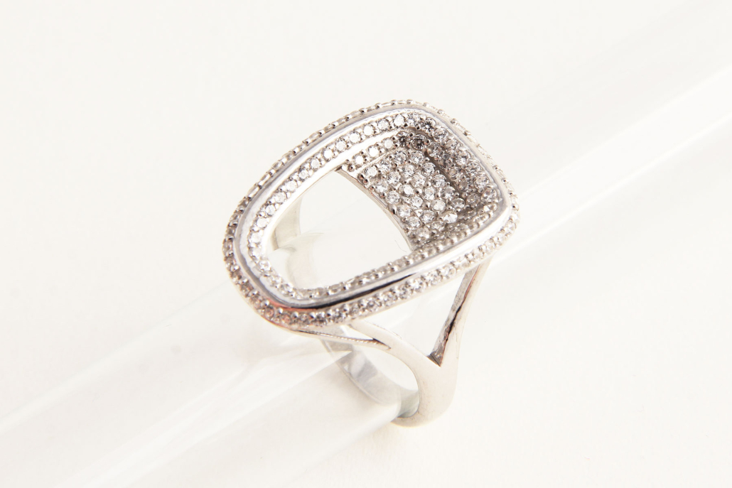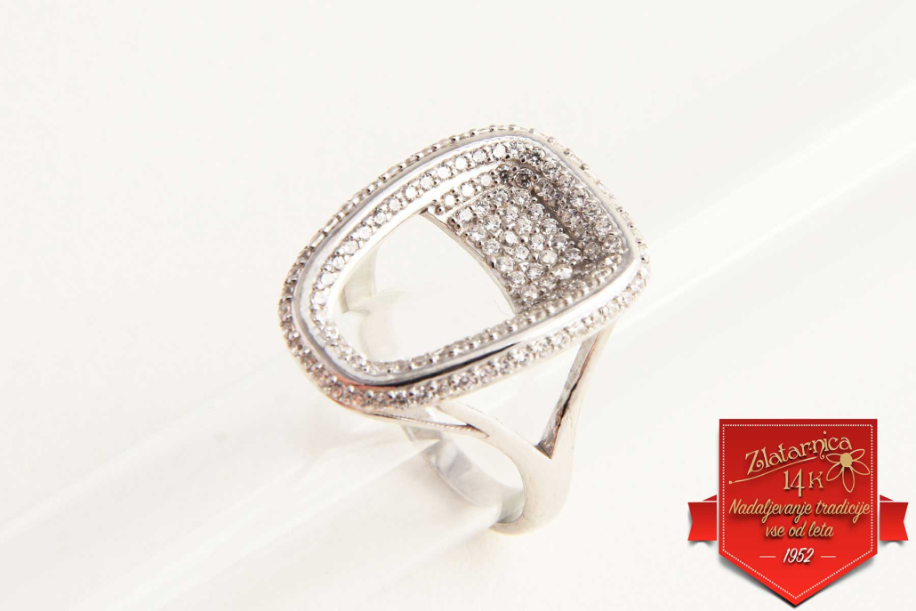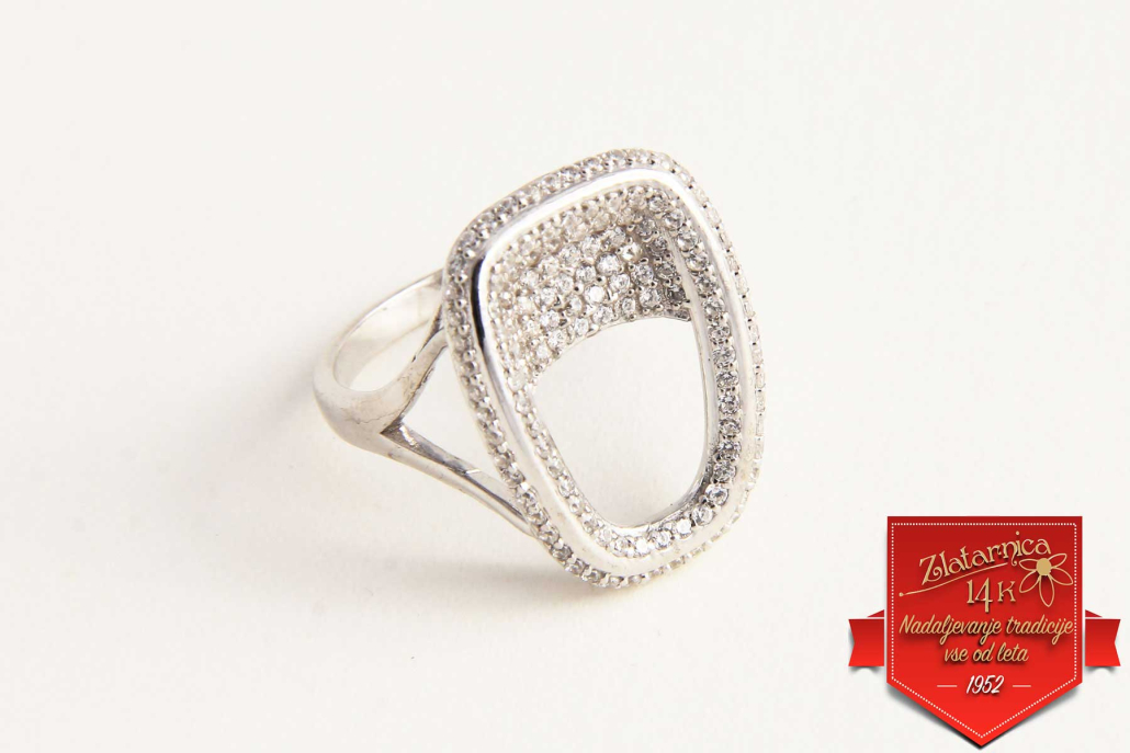 Elegantni srebrni prstan s prečno vstavljenim okvirjem, v celoti obdelanim s cirkoni.