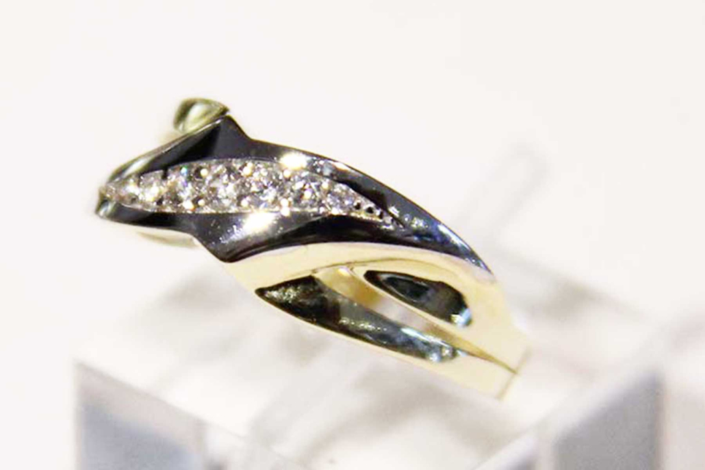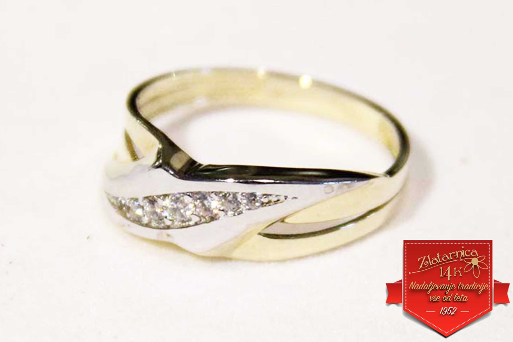 Ženski prstan iz rumenega zlata, med katerim je pas belega zlata, v katerem so prečno vkovani cirkoni.