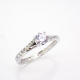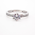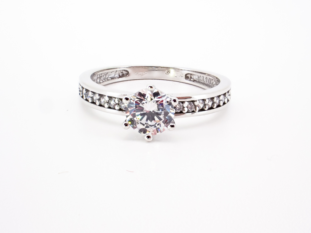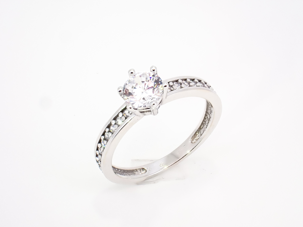 Ženski prstan iz belega zlata z linijo s cirkonov po obroču in večjim v osrednjem delu.