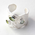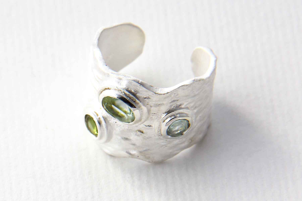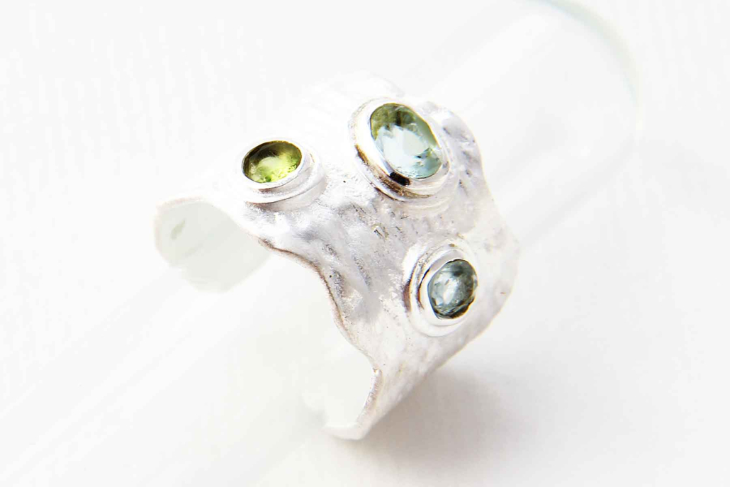Zanimiv prstan matirane površine z vstavljenimi modrimi topazi in peridotom.