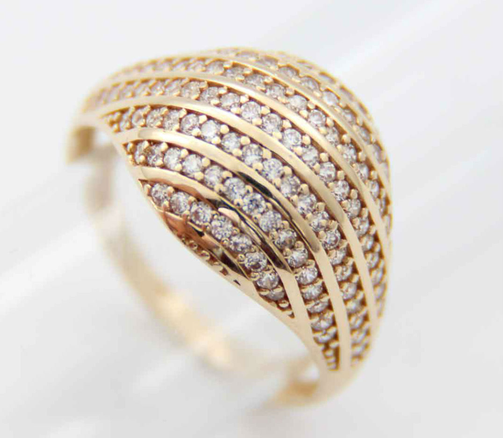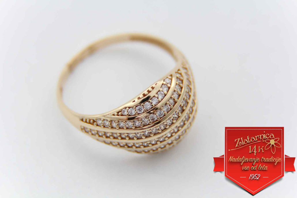 Široki in izbočen prstan iz rumenega zlata, na katerem se prepleta več pasov zlata. Izmenjujejo se gladki pasovi s pasovi s vkovanimi cirkoni.
