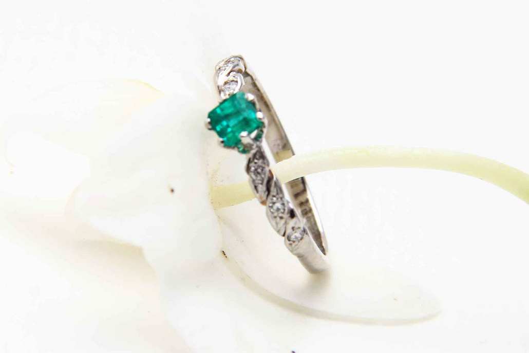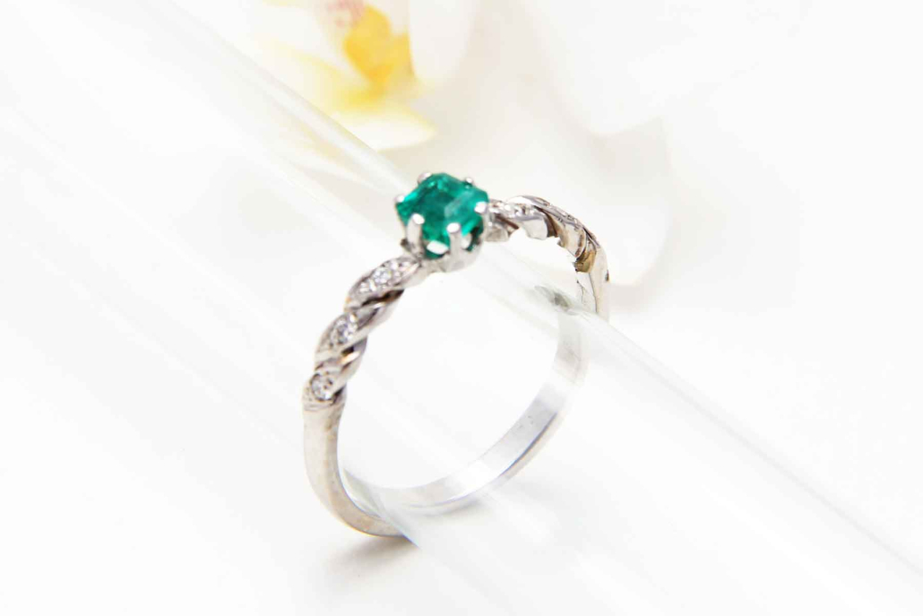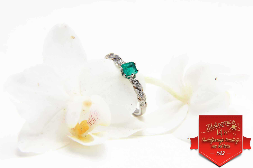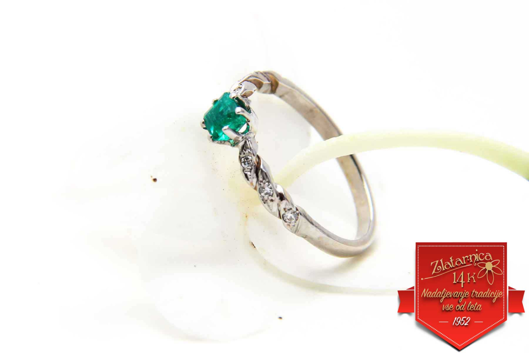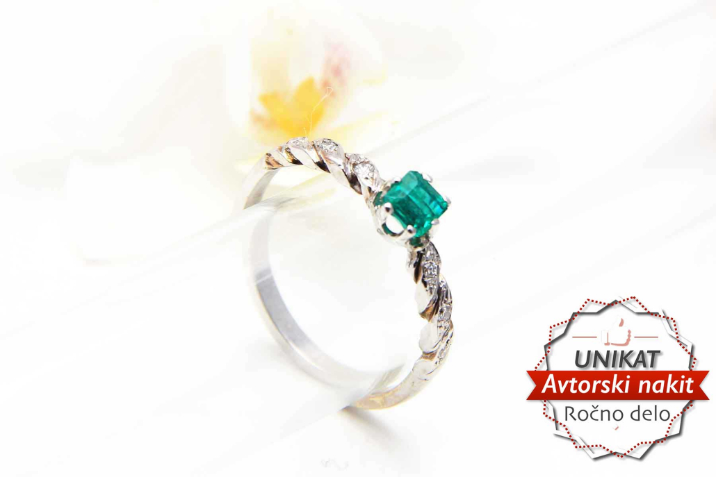 Unikaten, ročno izdelan prstan z naravnim smaragdom in šestimi briljanti po obroču iz belega zlata.