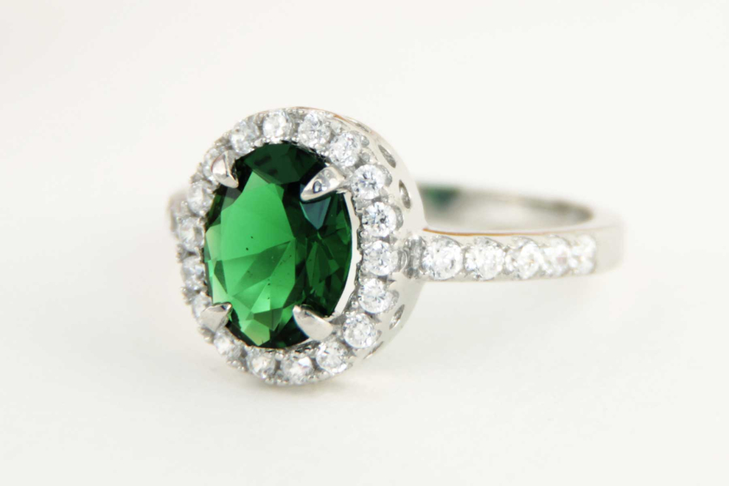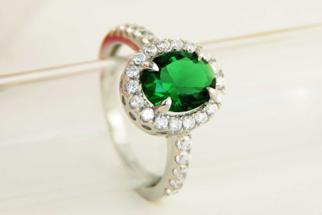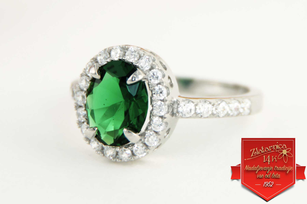 Srebrni prstan s sintetičnim emeraldom v klasični ovalni obliki, obdan s cirkoni.