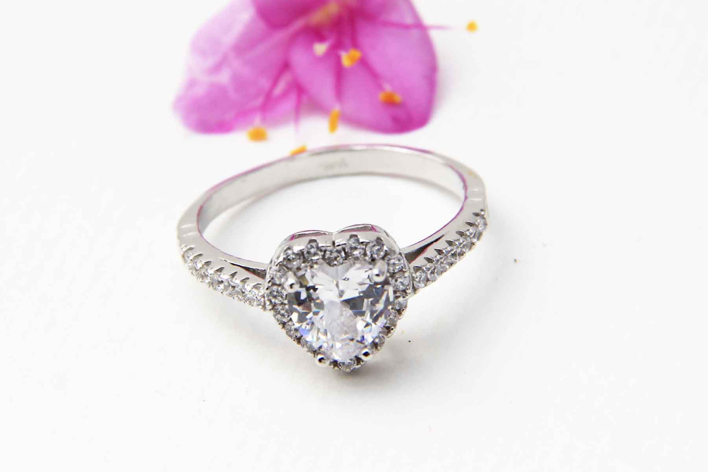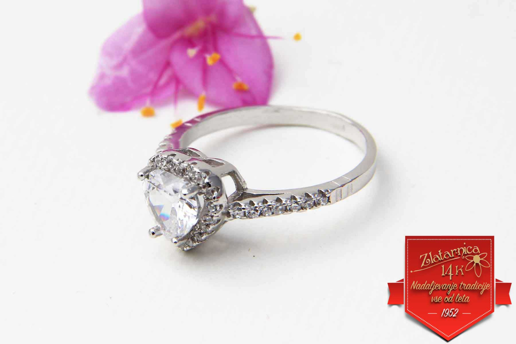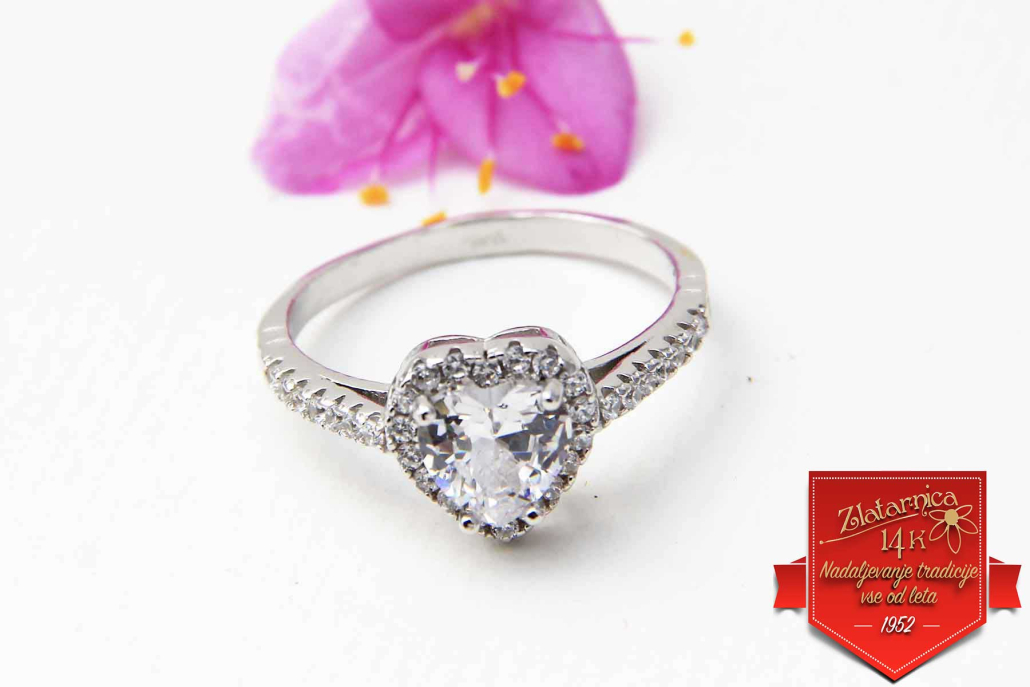 Srebrni prstan s cirkonom v obliki srčka, obrobljen z manjšimi cirkoni, ki se nadaljujejo tudi po obroču.