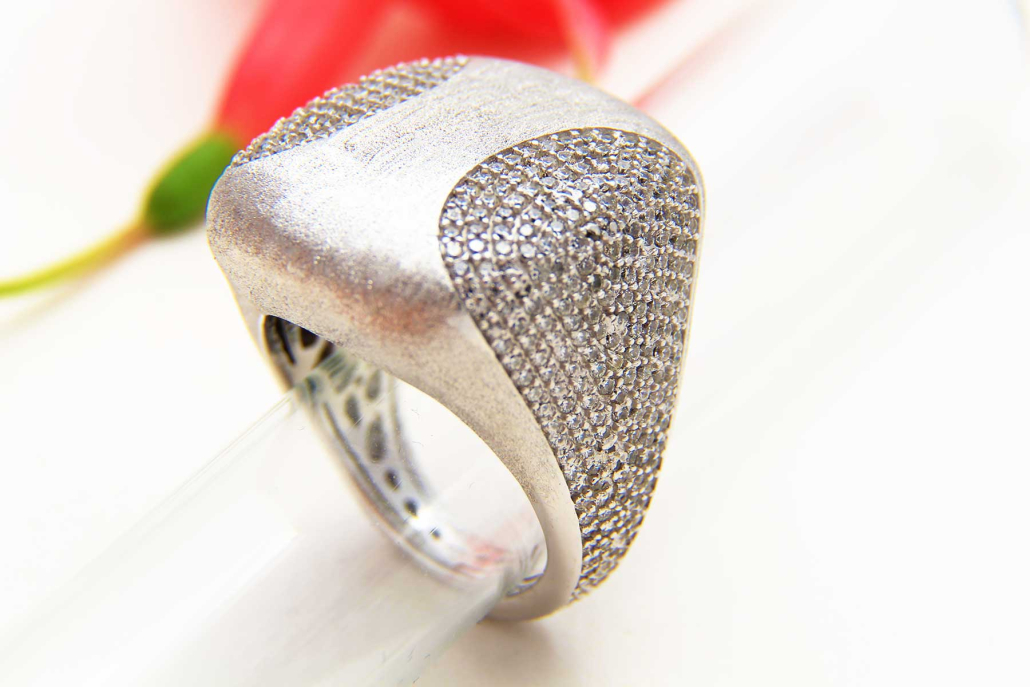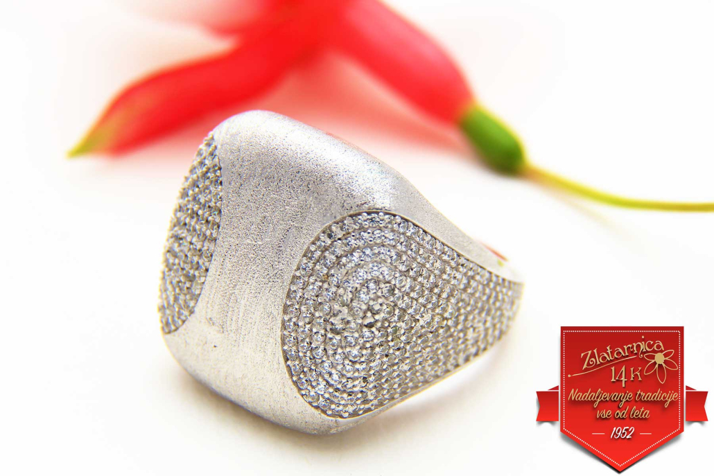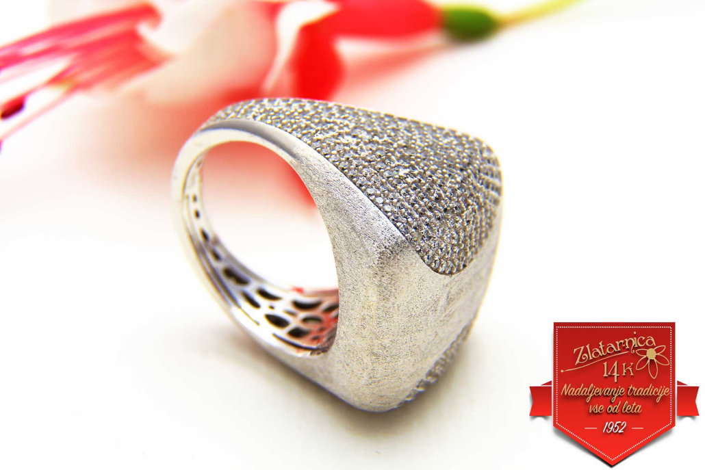 Ekstravagantni, masivni srebrni prstan ledeno mat površine, ki je se na vrhu loči v dve polkrožni liniji obdelani z drobnimi cirkoni skozi cel obroč.