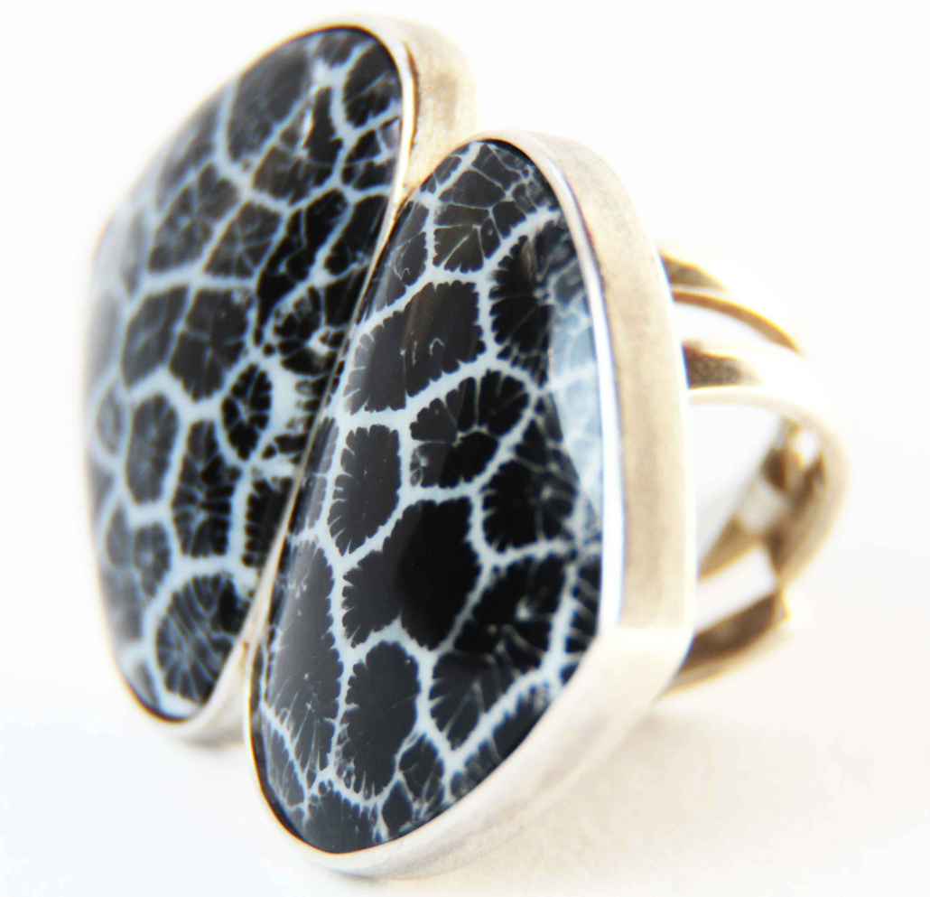 Unikaten, ročno izdelan masiven prstan z dvema velikima črnima koralama na vrhu.