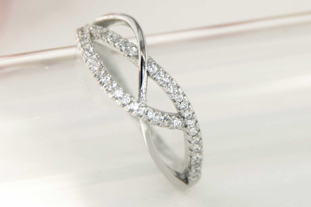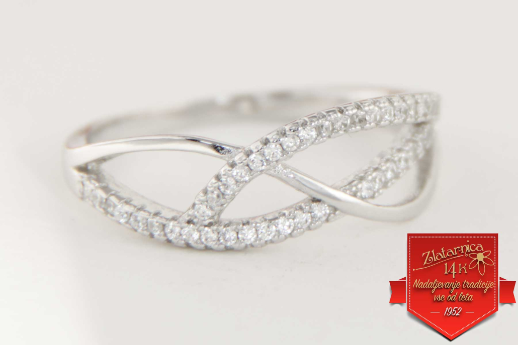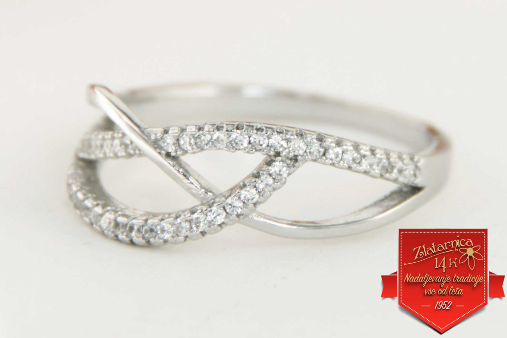 Elegantni srebrni prstan prepletajočih linij – obdelanih s cirkoni in gladkih.