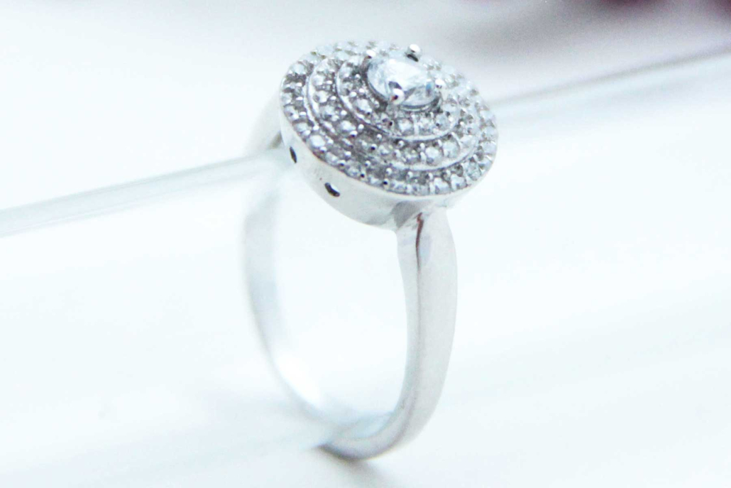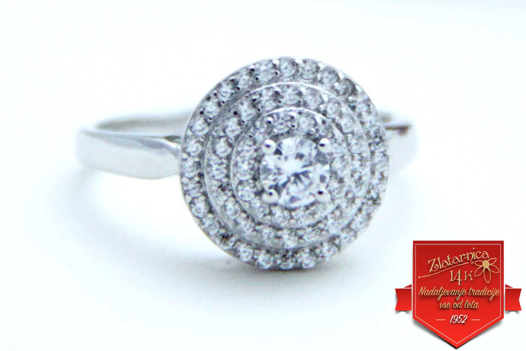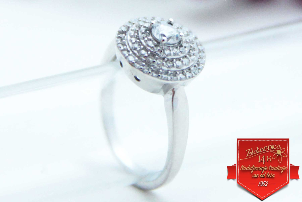 Elegantni srebrni prstan z okroglim privzdignjenim delom v obliki krone, v celoti obdelane s cirkoni.