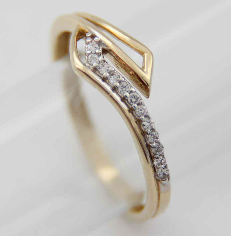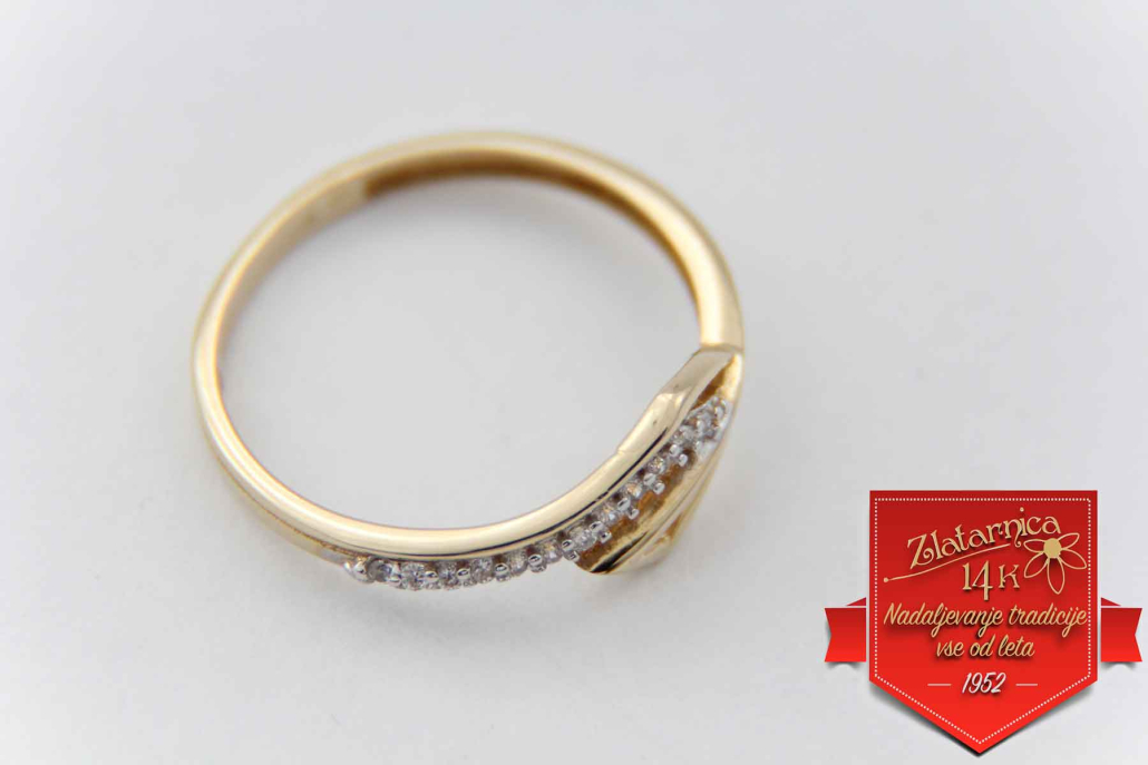 Prstan iz ozkih pasov iz rumenega zlata, ki so prepleteni s pasom iz belega zlata, v katerega so vkovani cirkoni.