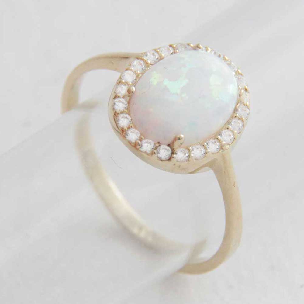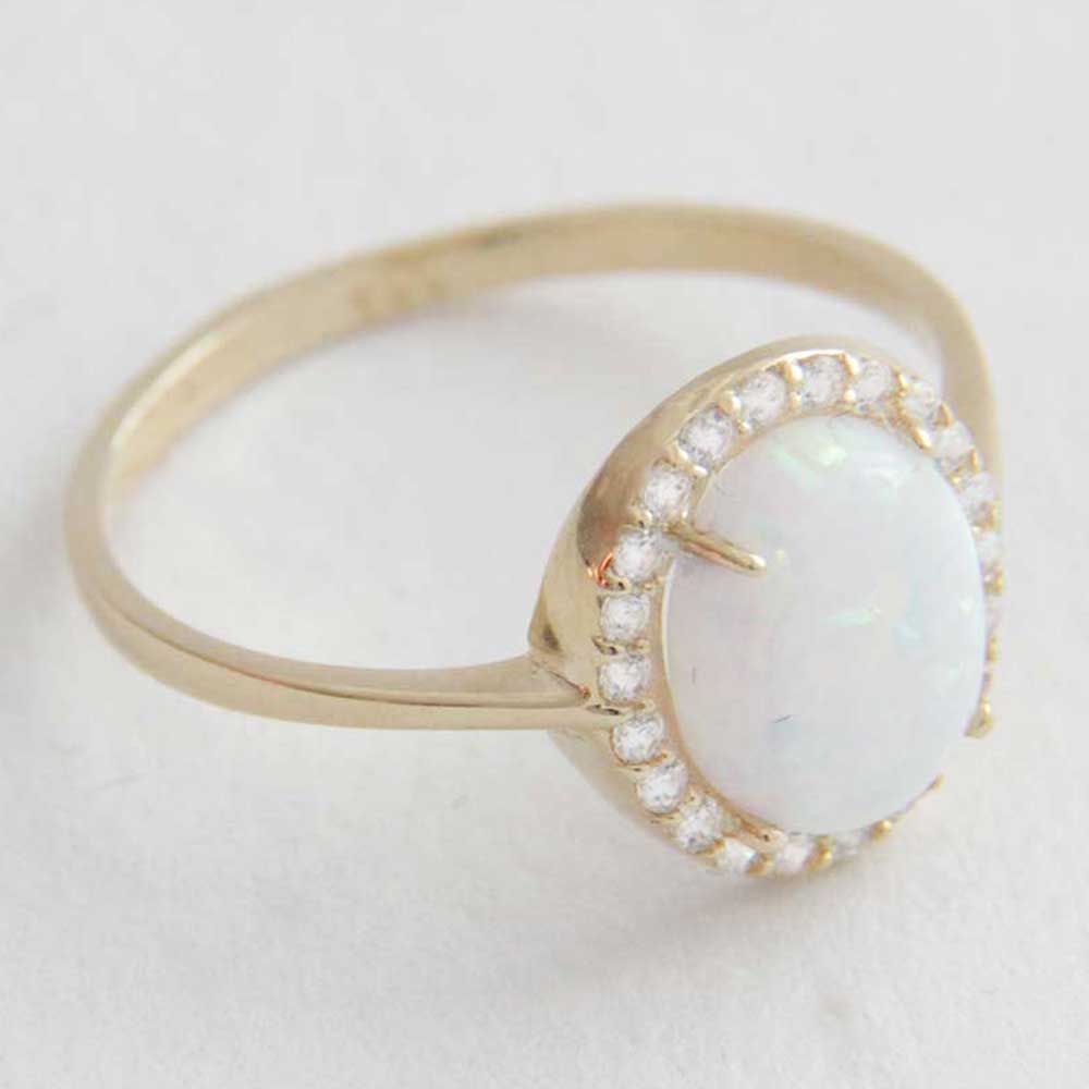 Ženski prstan iz rumenega zlata z ovalnim opalom, ki ga obdajajo cirkoni.