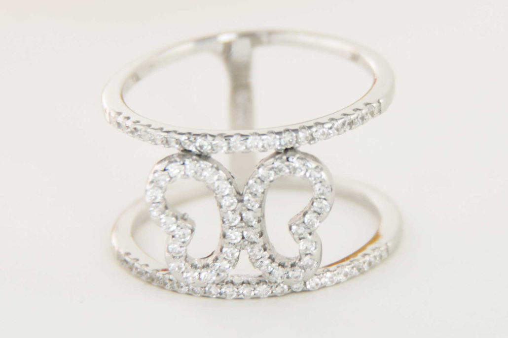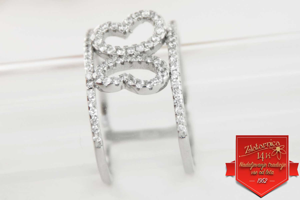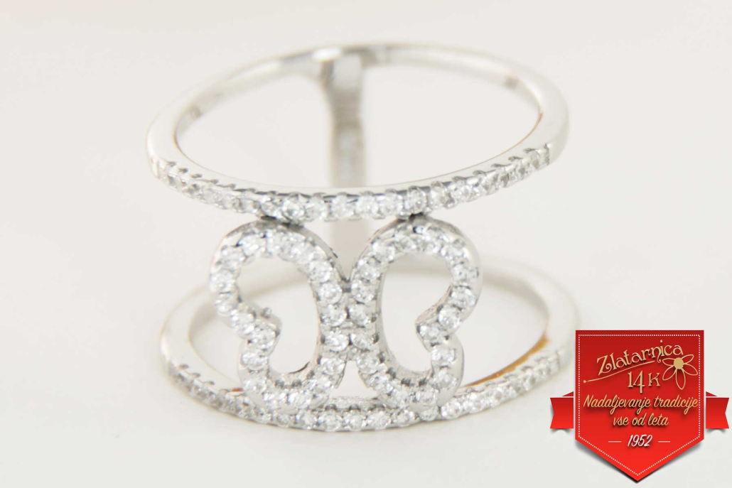 Elegantni srebrni prstan, sestavljen iz dveh obročkov, med katerima je ujet metulj, okrašen s cirkoni.