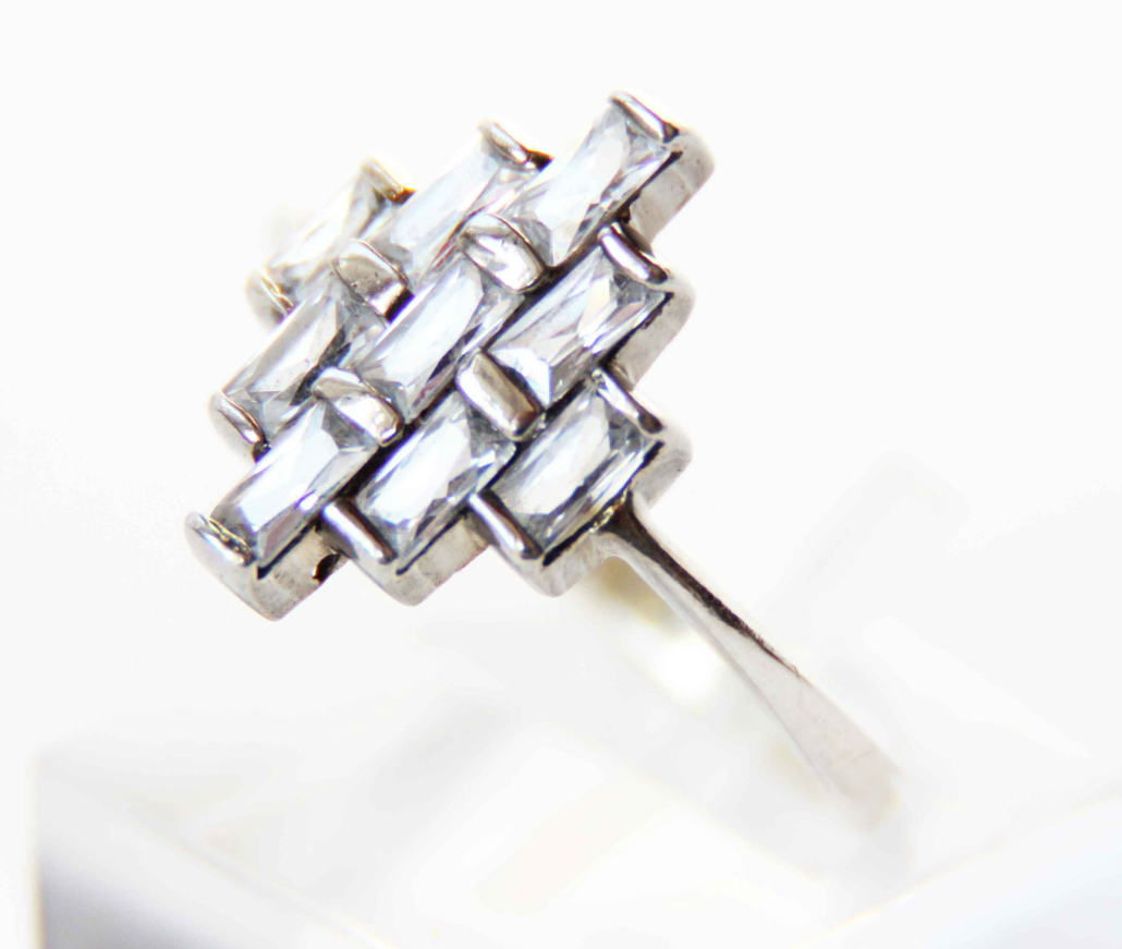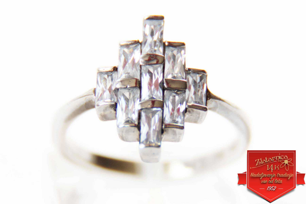 Srebrni prstan s cirkoni, postavljenimi v obliko kare.