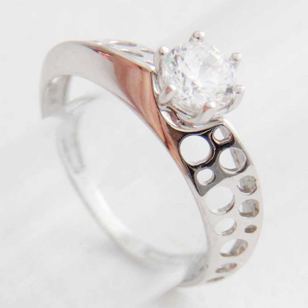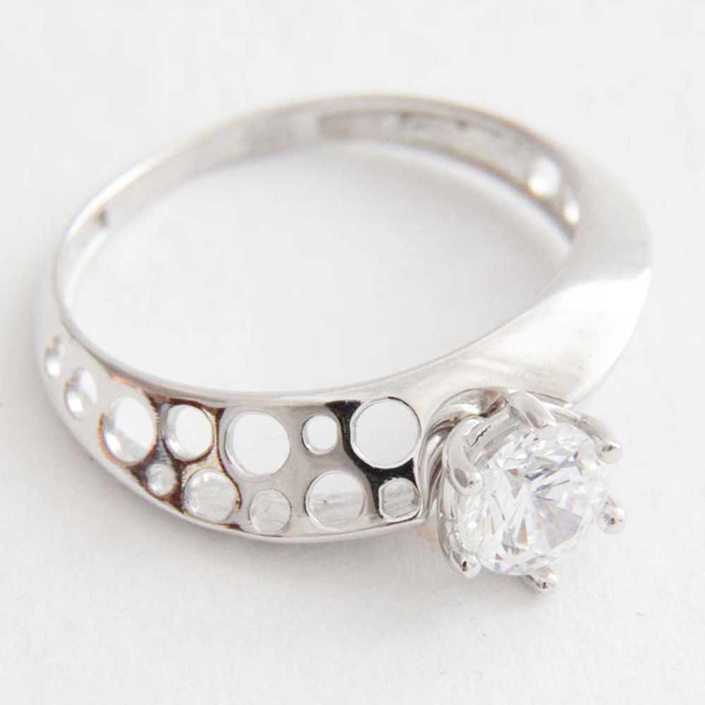 Eleganten prstan iz belega zlata z luknjicami in večjim cikonom v osrednjem delu.
