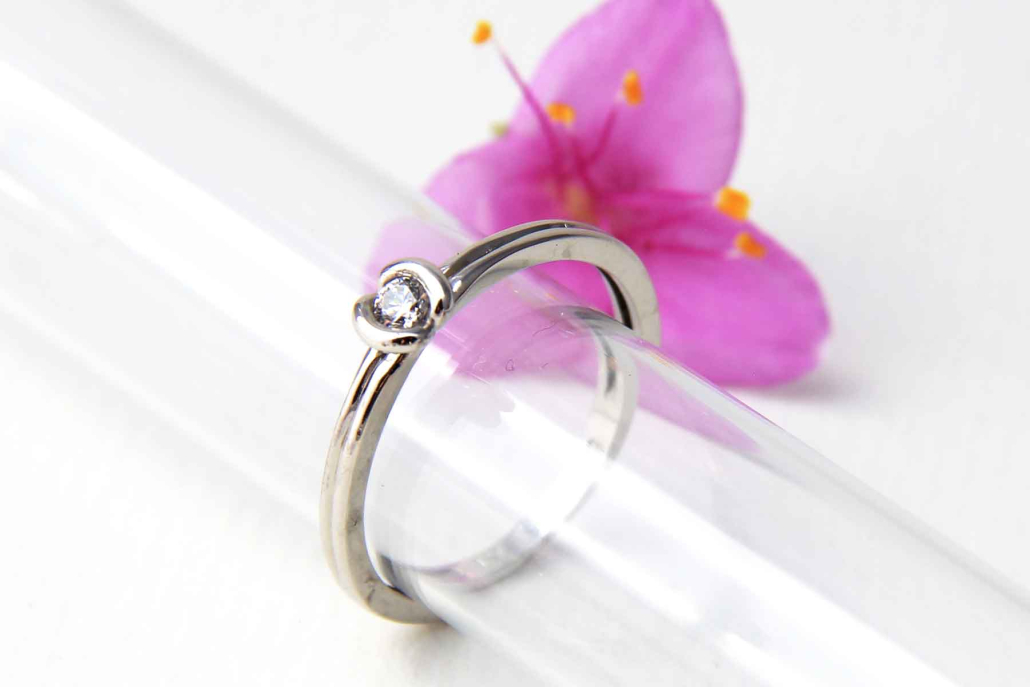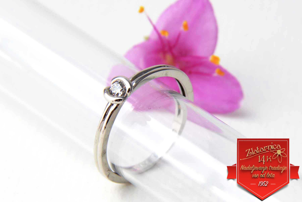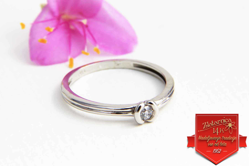 Minimalistični ženski prstan-obroček iz belega zlata z cirkonom v osrednjem delu.