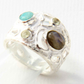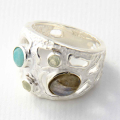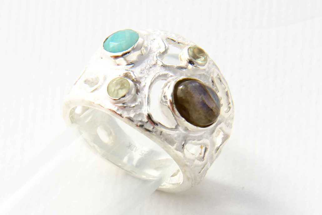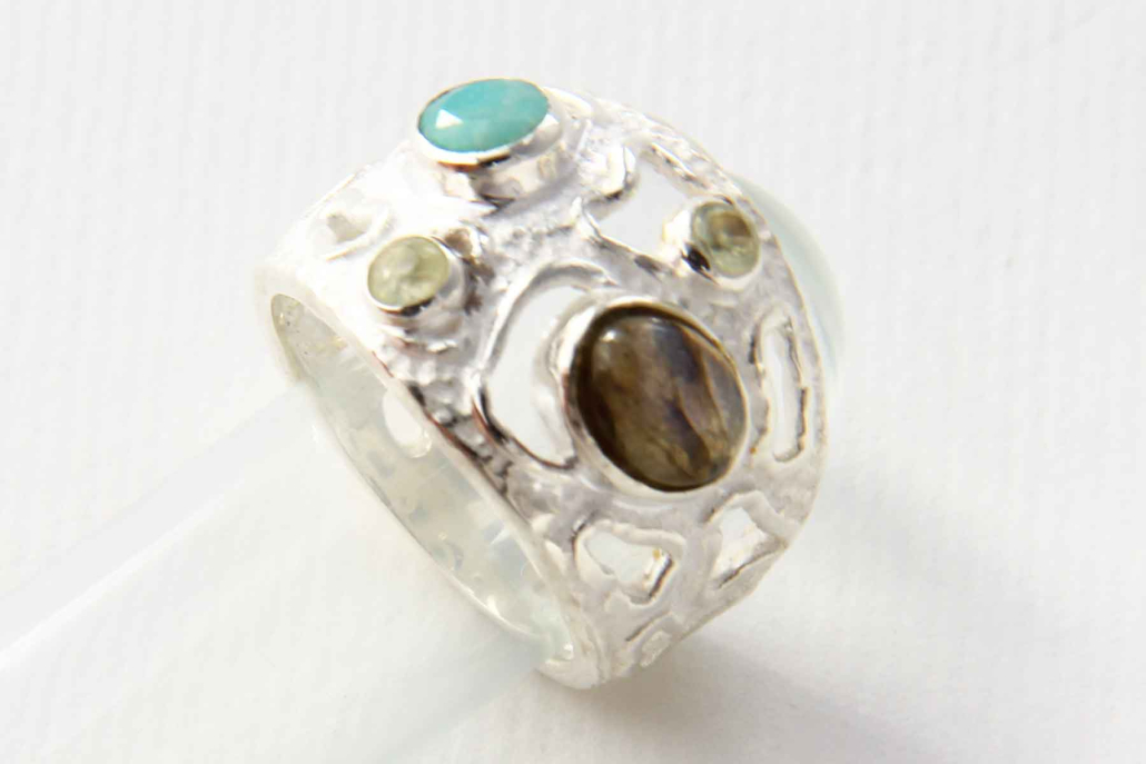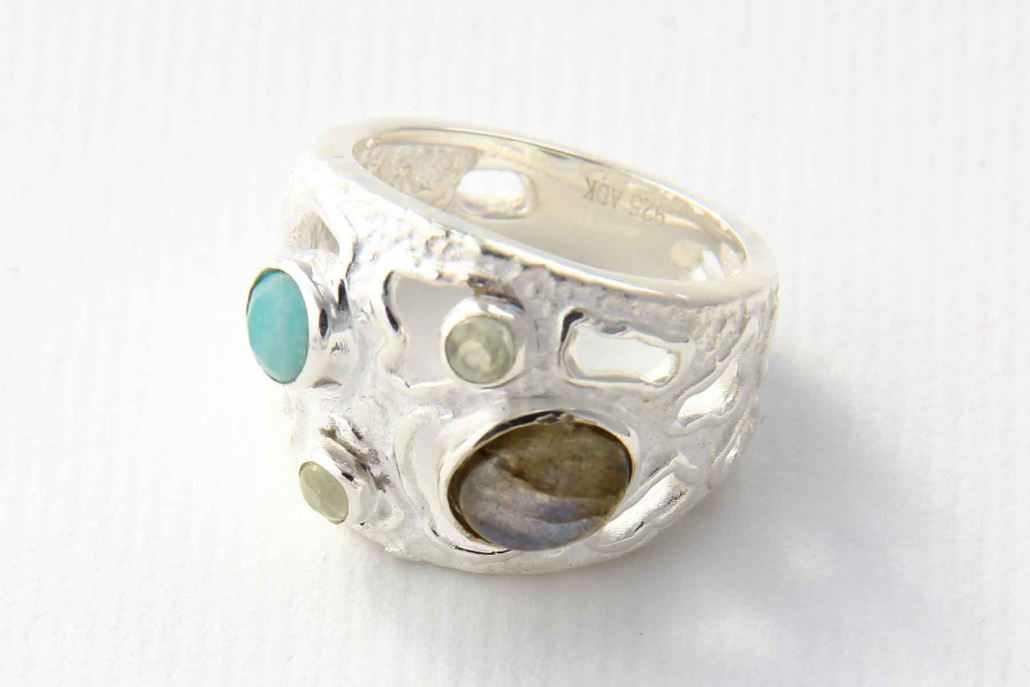 Masiven prstan organskega vzorca z labradoritom, amazonitom in zelenimi granati.