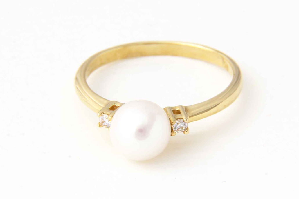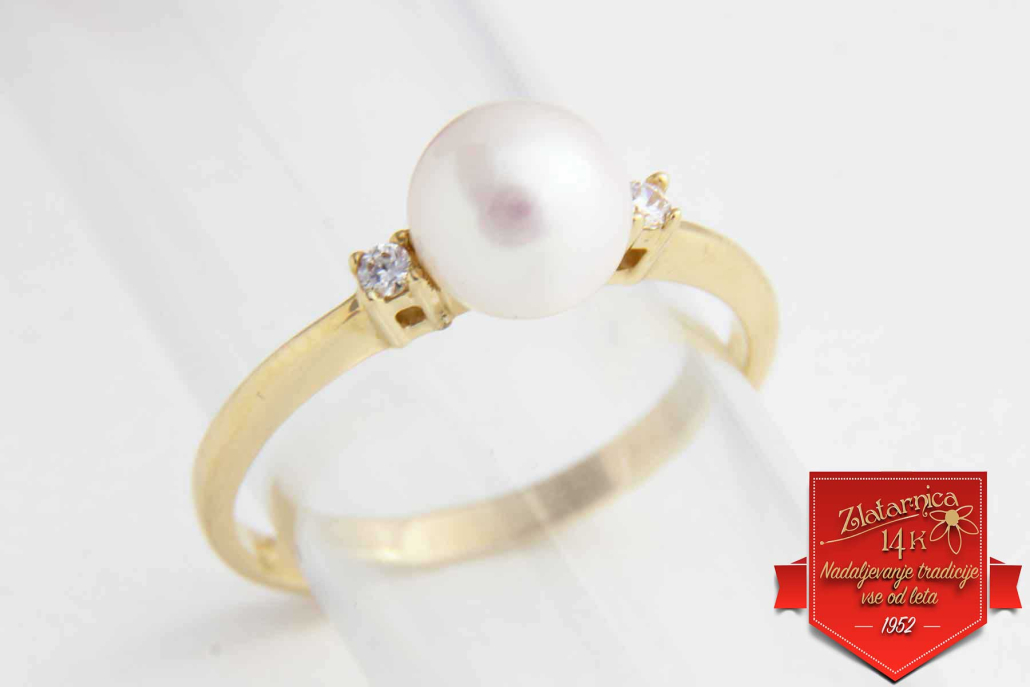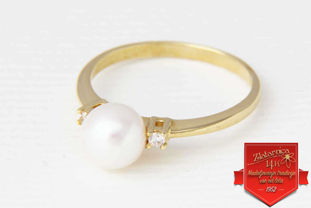 Klasični ženski soliter prstan iz rumenega zlata, s sladkovodnim biserom, obdanim z dvema cirkonoma.