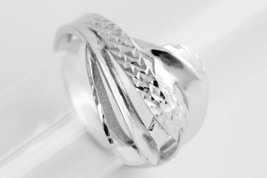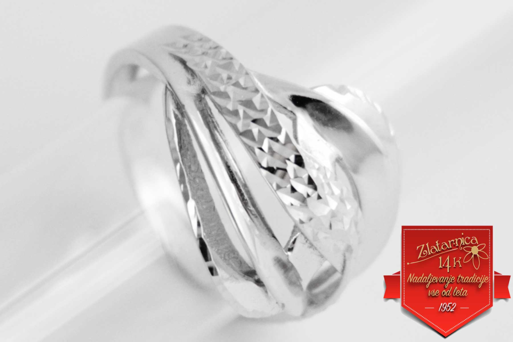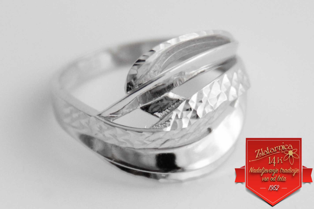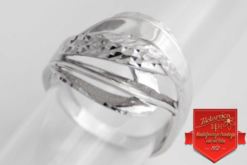 Širok ženski prstan iz belega zlata sestavljen iz izbočenih in konkavnih linij z okrasno gravuro, ki dajejo prstanu videz vkovanih kamnov.