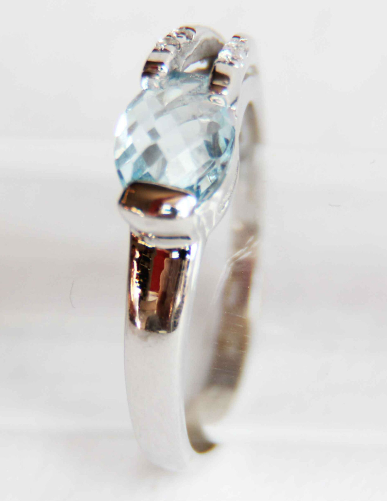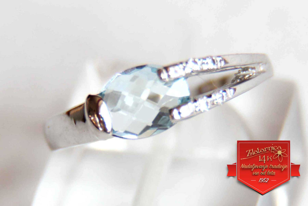 Prstan iz belega zlata z naravnim svetlo modrim topazom in cirkoni v dveh pasovih.
