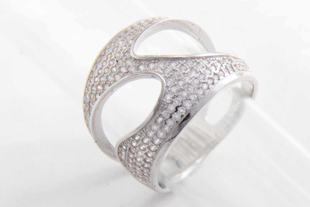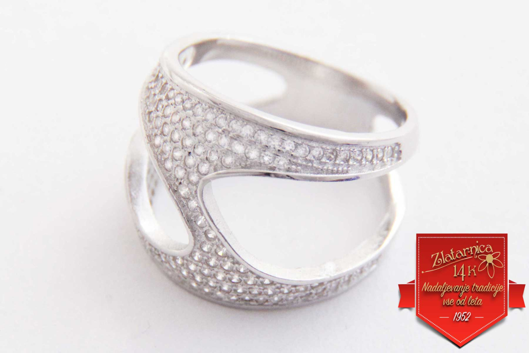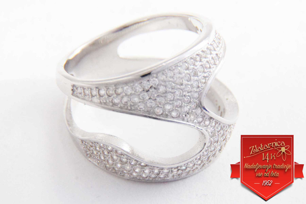 Eleganten in bogat srebrni prstan v obliki puzzle, v celoti obdelan c sirkoni.