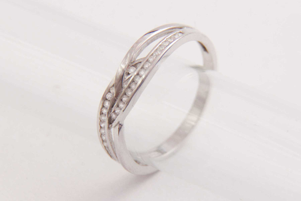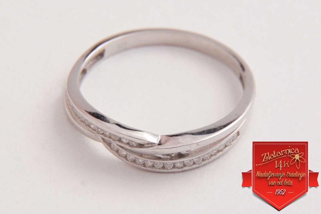 Eleganten srebrni prstan s cirkoni, vkovanimi v dve liniji, ki se križata z gladkim pasom.