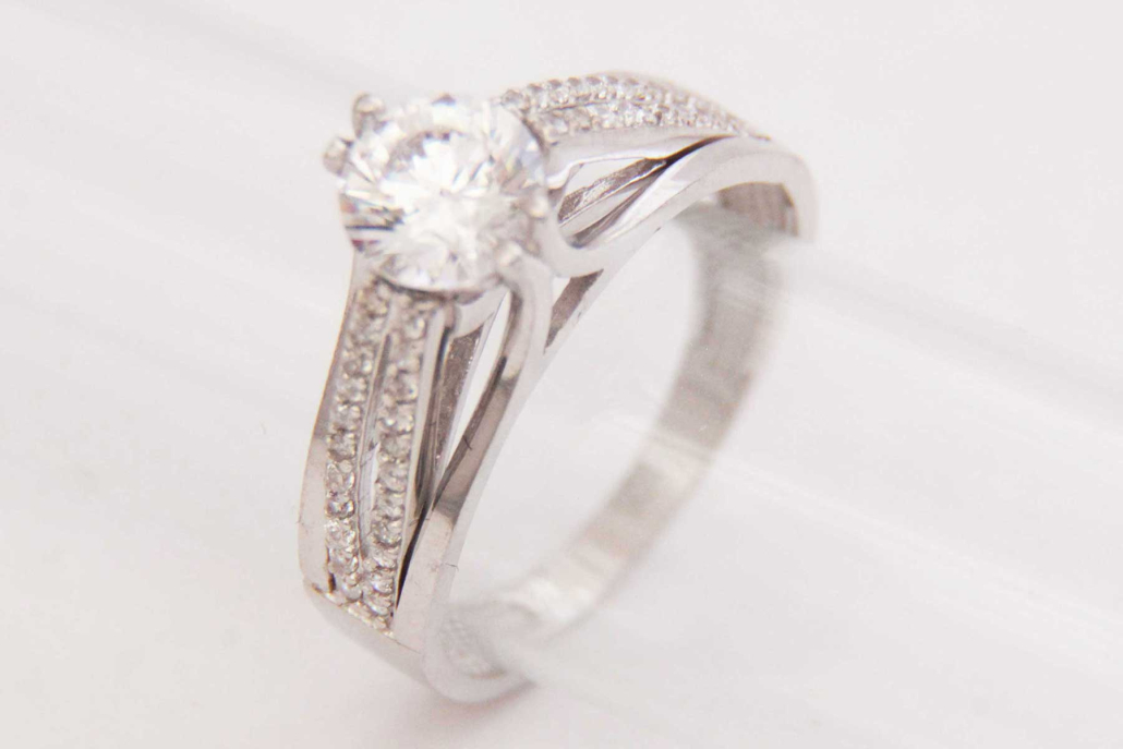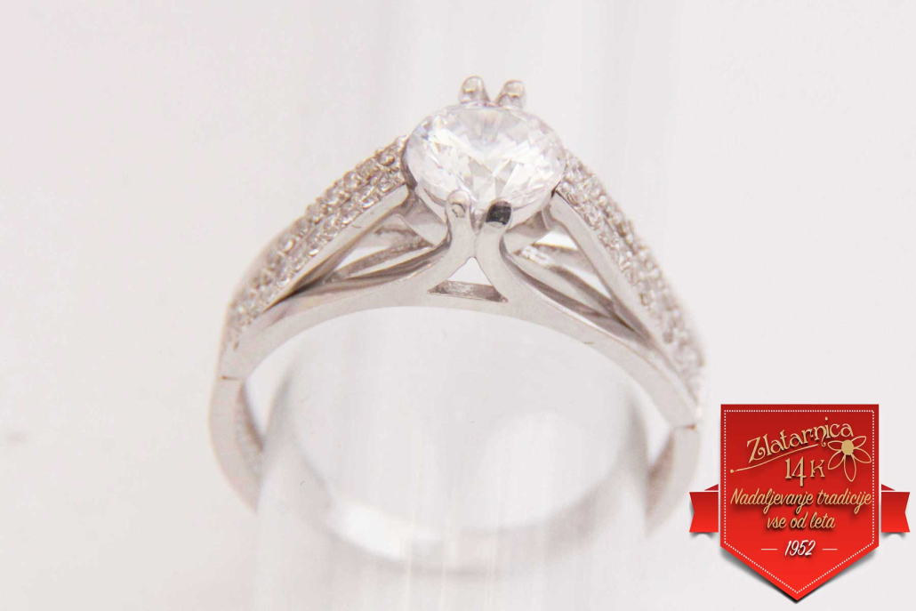 Posebna oblika soliterja z večjim cirkonom, ujetim med dve liniji, obdelani z manjšimi cirkoni vzdolž prstana na obeh straneh.