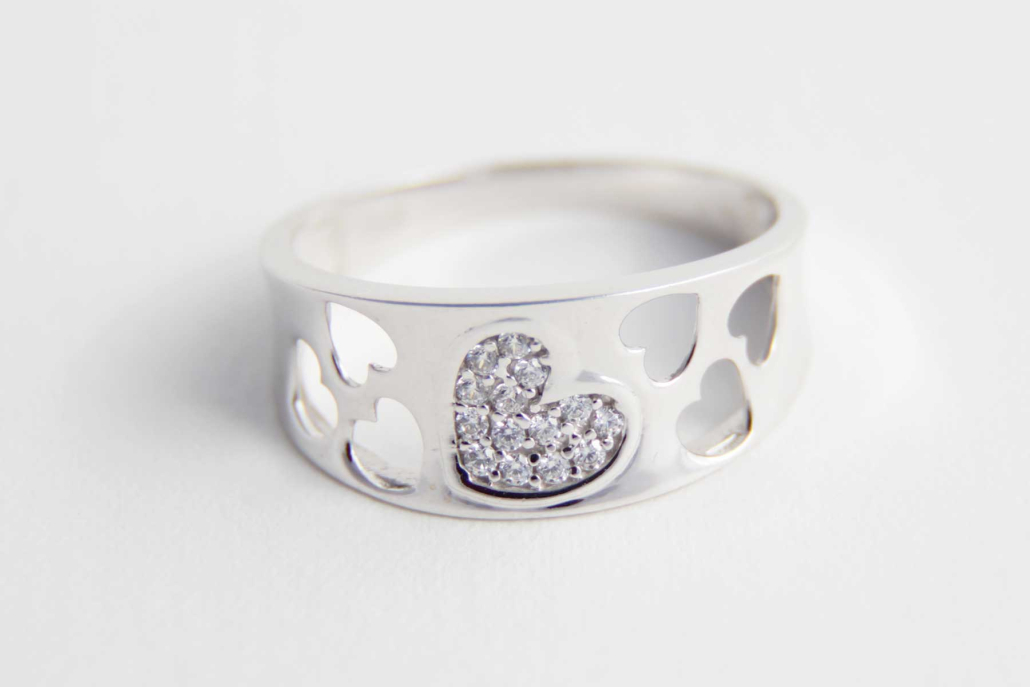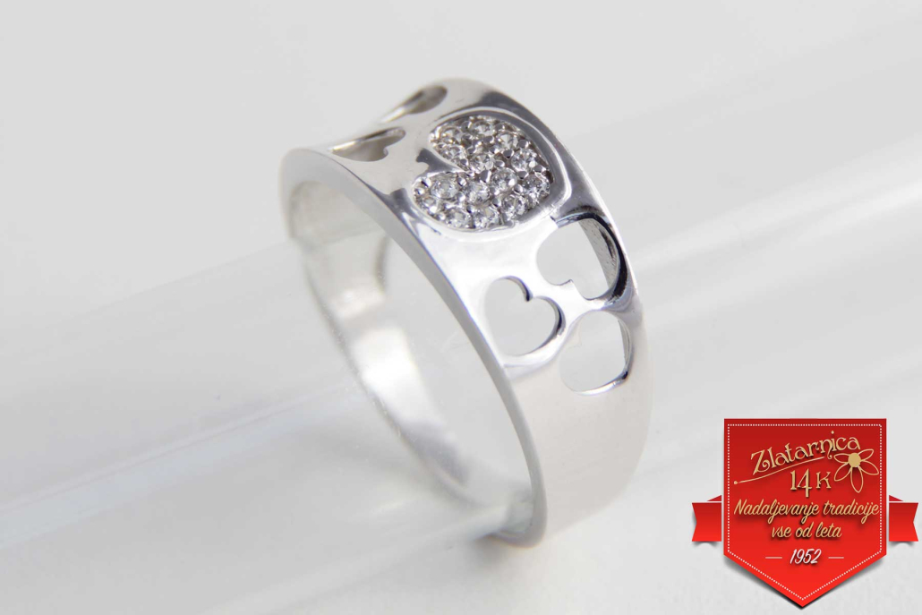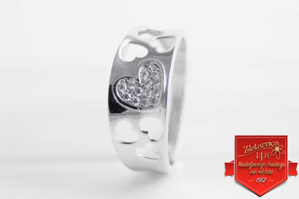 Širši prstan iz belega zlata s srčki. Na sredini prstana je srček, znotraj katerega so vkovani cirkoni. Na vsaki strani srčka so po trije izrezani srčki, ki dajejo prstanu še dodaten romantični videz.