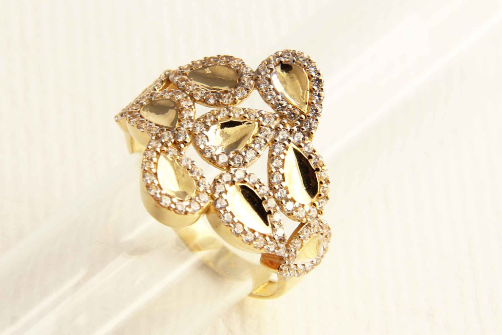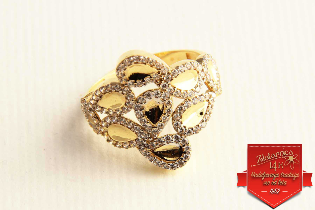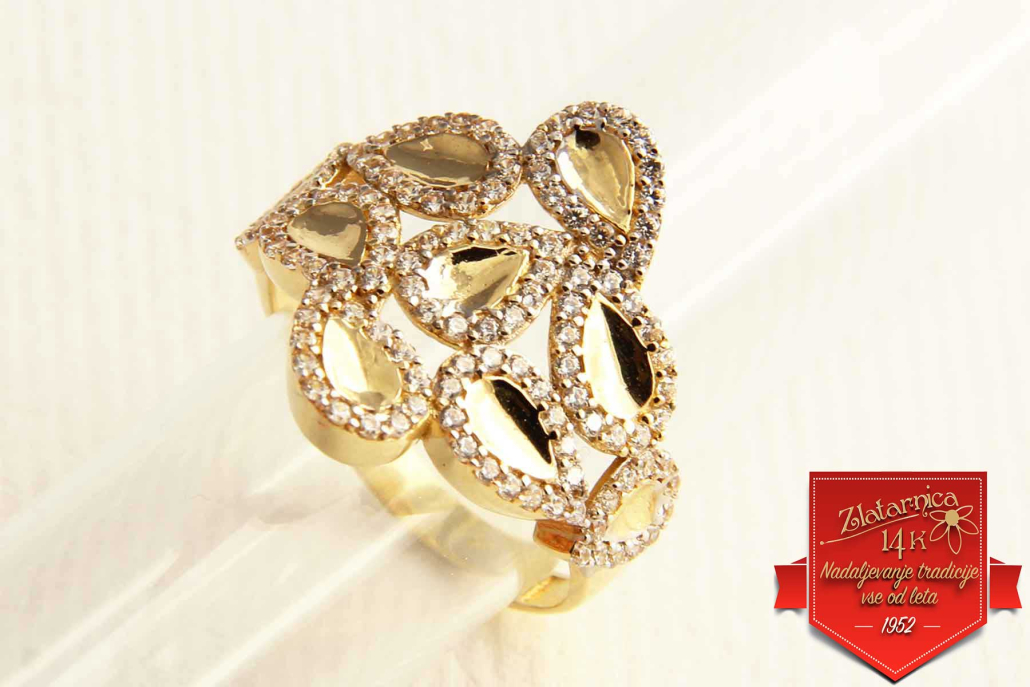 Široki prstan iz rumenega zlata, sestavljen iz gladkih kapljic, ki so obrobljene s cirkoni.