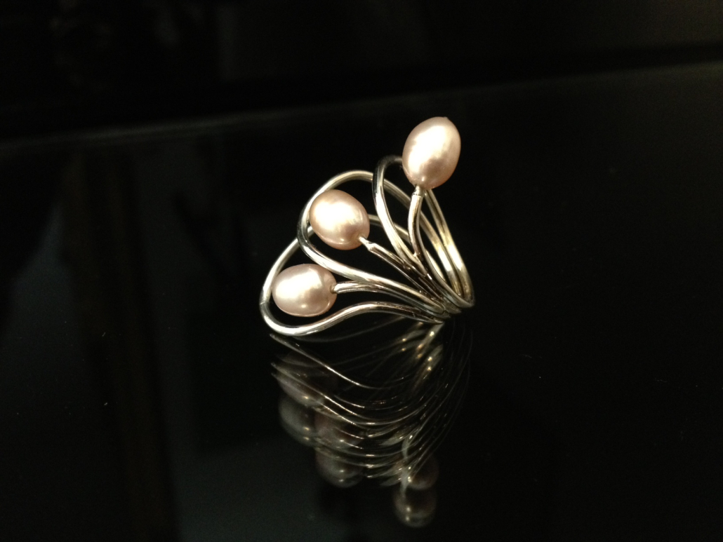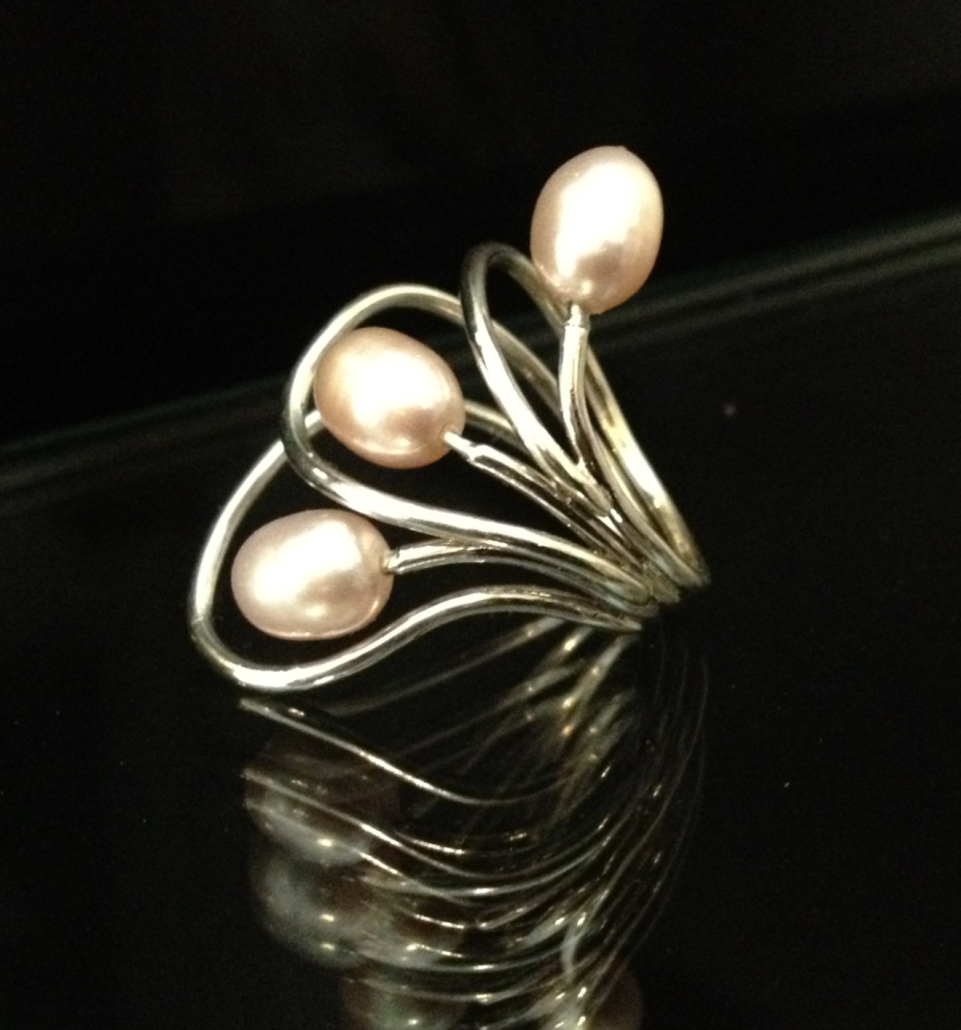 Unikaten, ročno izdelan prstan z roza sladkovodnimi biseri hruškaste oblike.