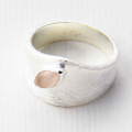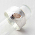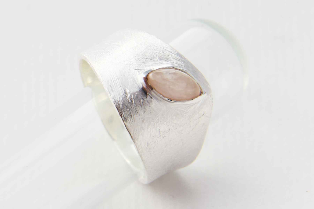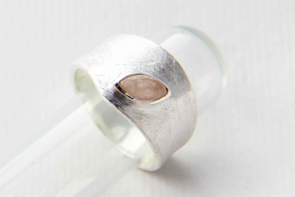 Srebrni prstan z roževcem v obliki čolniča na matirani podlagi, ki spominja na led.