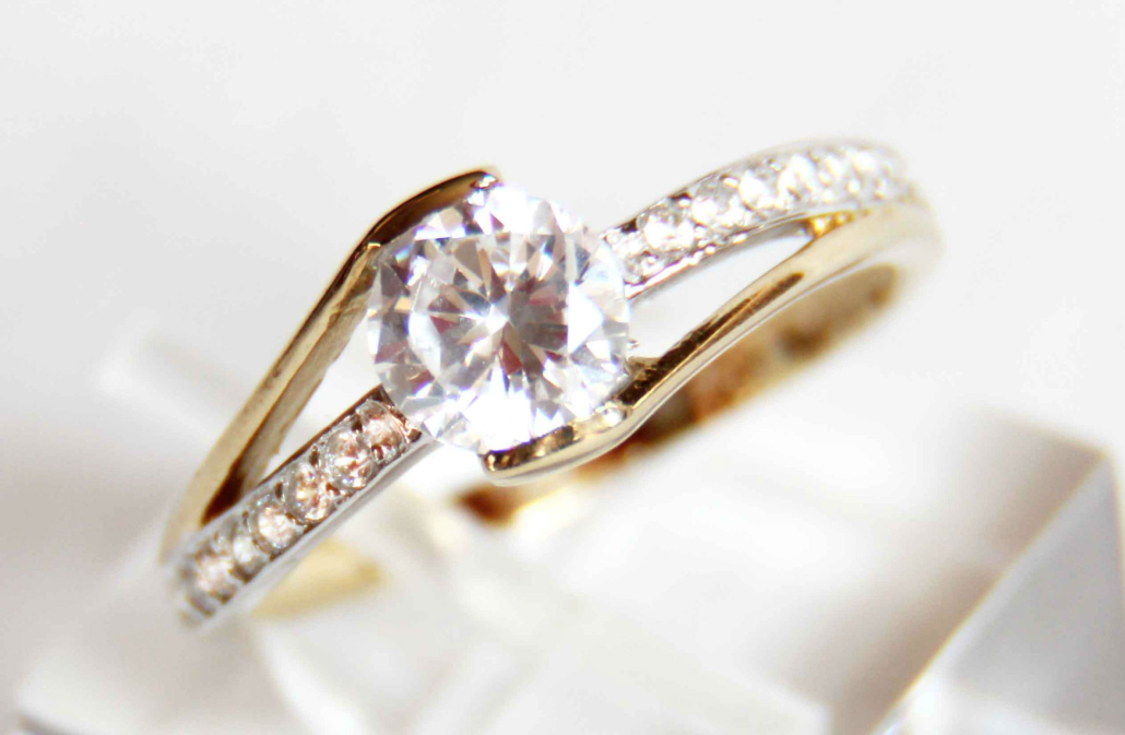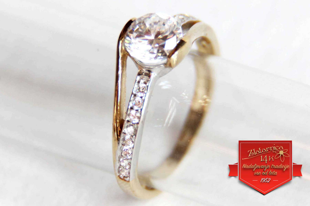 Prstan z vkovanimi cirkoni po osrednjem delu obroča in večjim cirkonom v sredini, ki je vpet med dvema pasovoma.