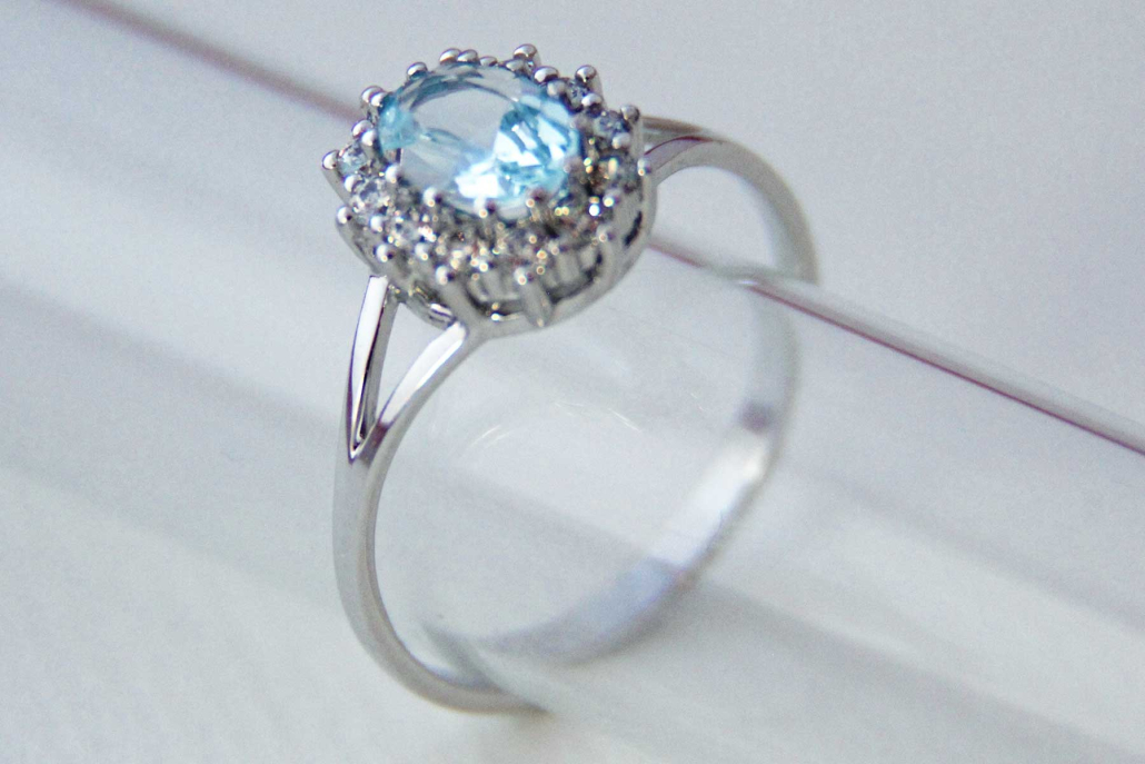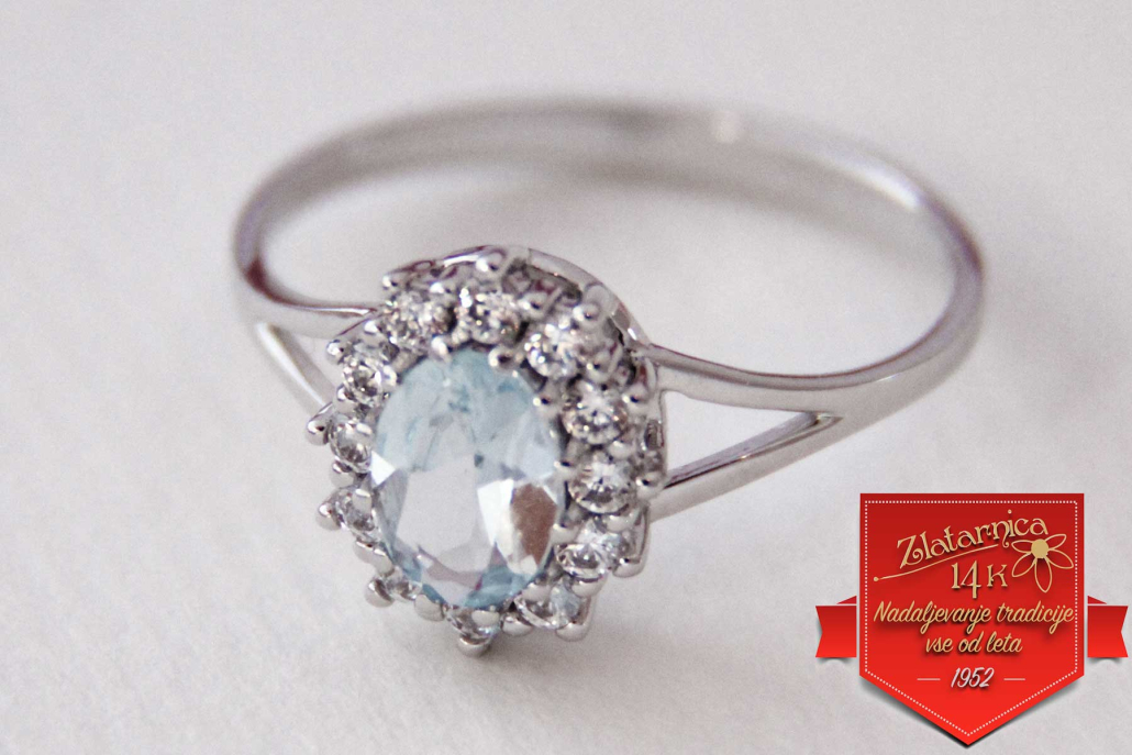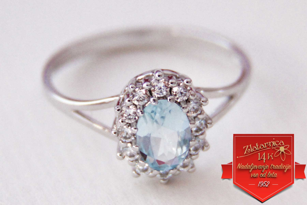 Klasični ženski prstan iz belega zlata z ovalnim modrim topazom in obrobljen s cirkoni.