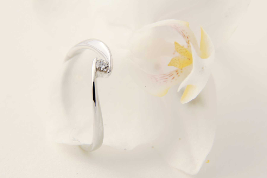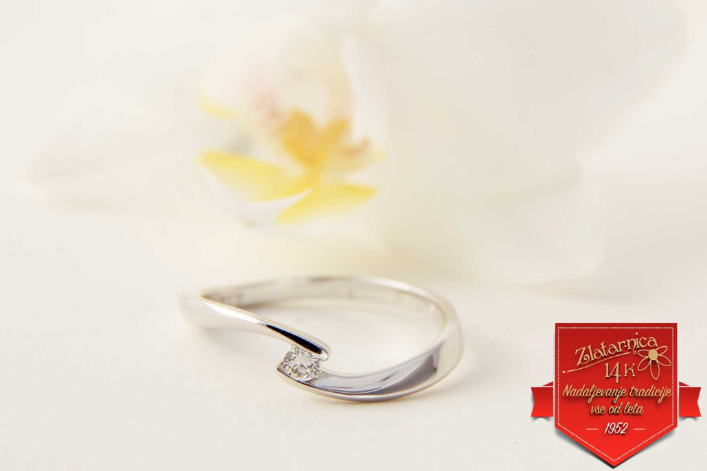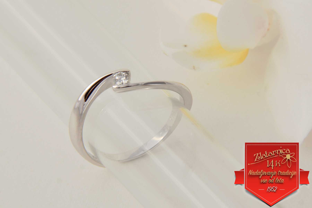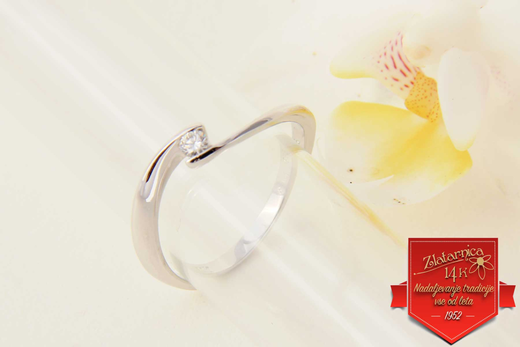 Asimetrični zaročni prstan iz belega zlata z briljantom med prekinjenim obročem s certifikatom o skladnosti in pristnosti.
