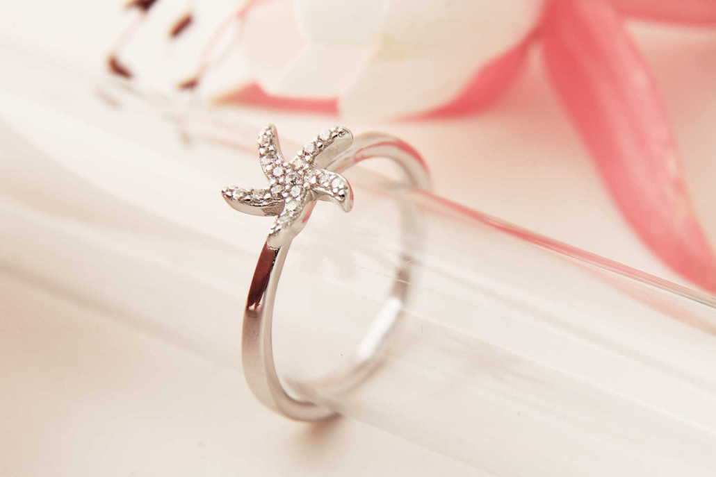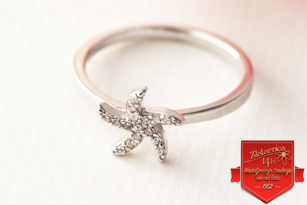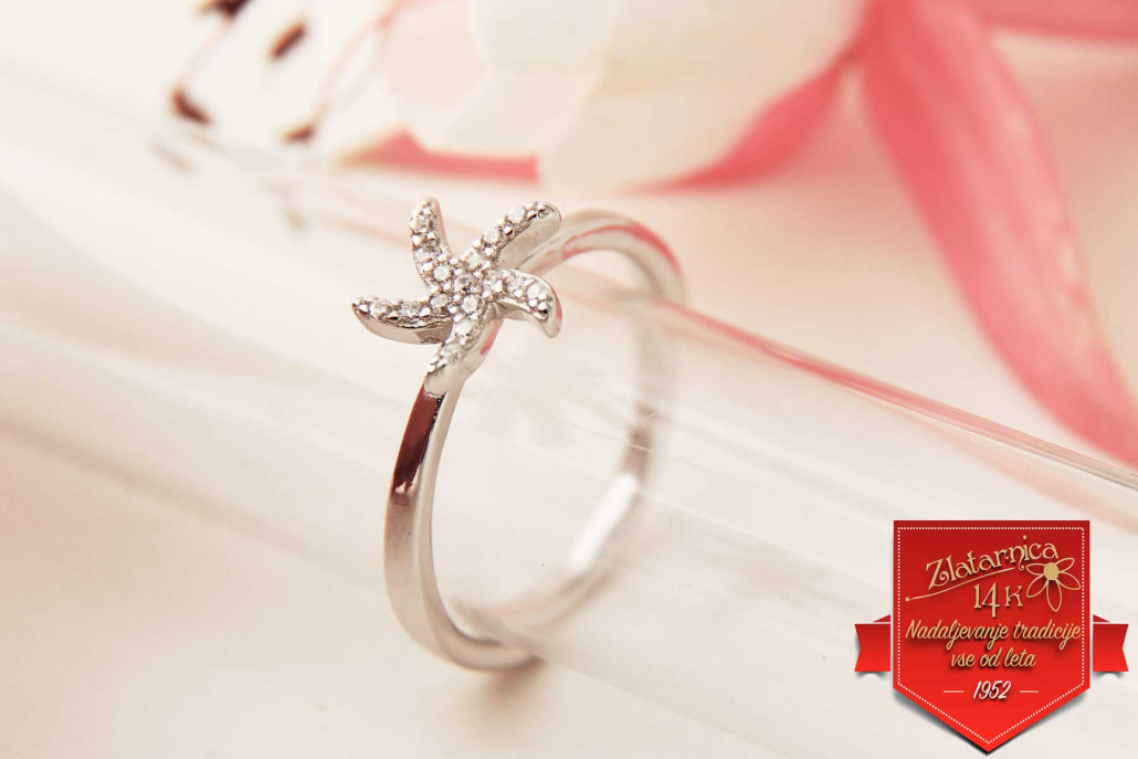 Elegantni srebrni obroček z vzorcem morske zvezde v osrednjem delu, ki je okovana s cirkoni.