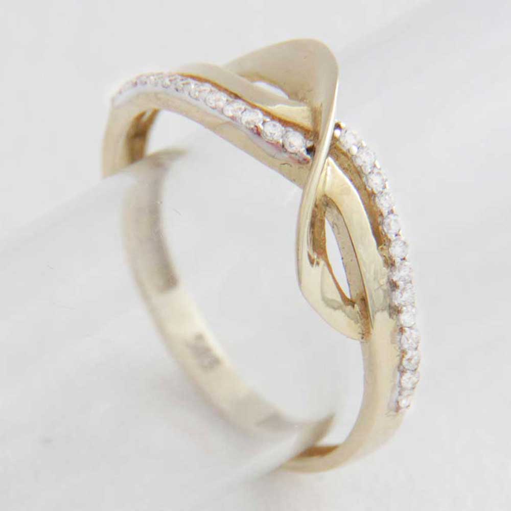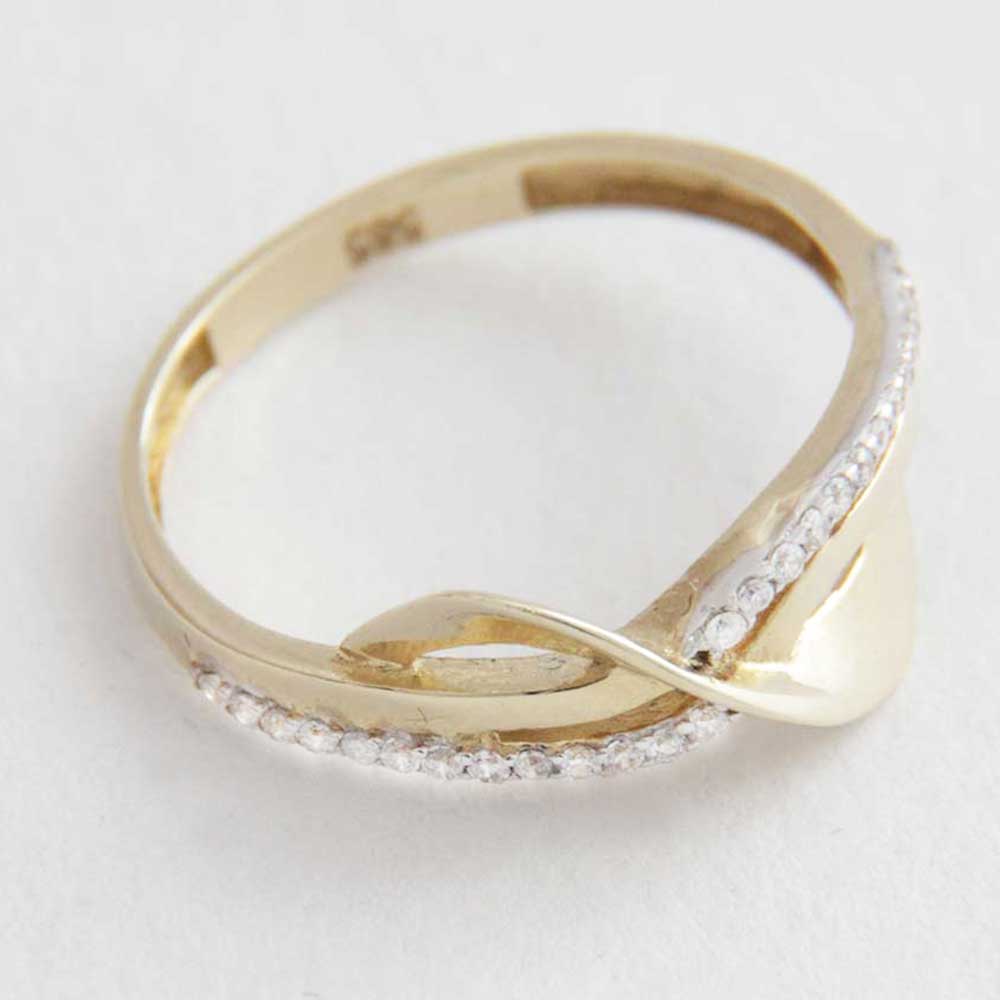 Ženski prstan iz rumenega zlata z nasproti ležečimi linijami cirkonov in prečno pentljo.