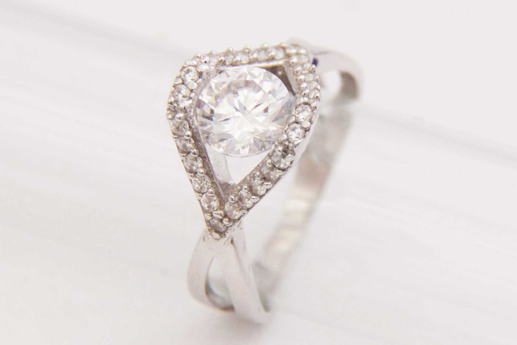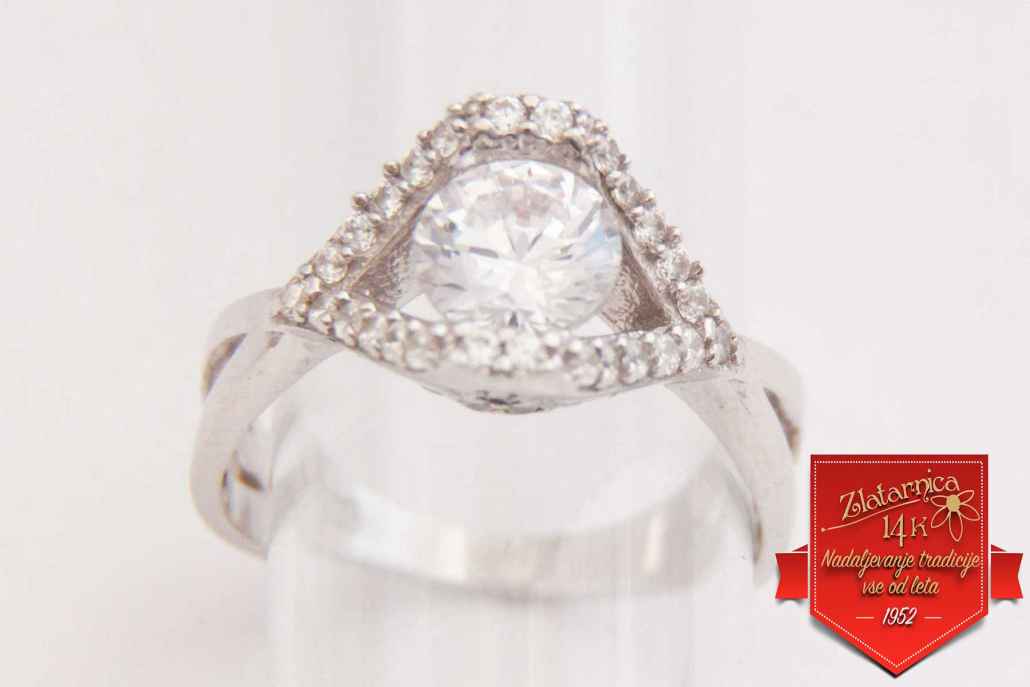Posebna oblika soliterja z večjim cirkonom, ujetim med manjše cirkone križem prstana na obeh straneh.