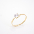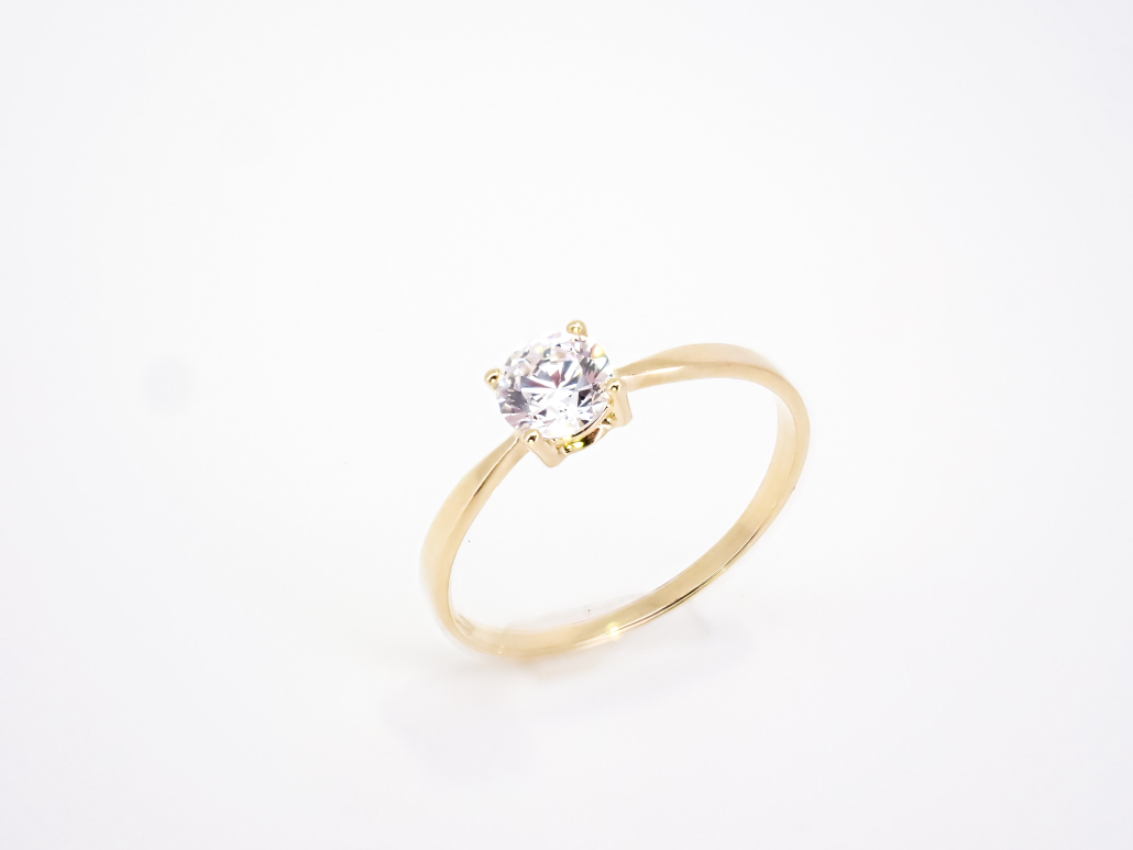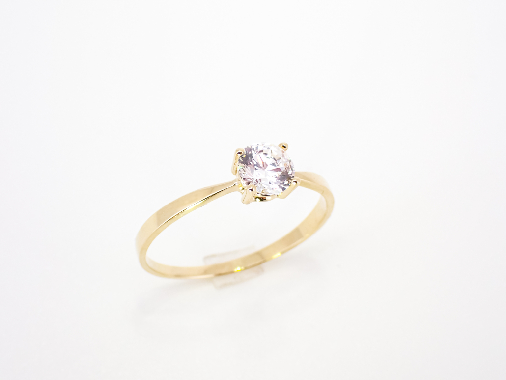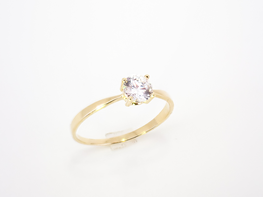 Klasični ženski prstan iz rumenega zlata s cirkonom v osrednjem delu.