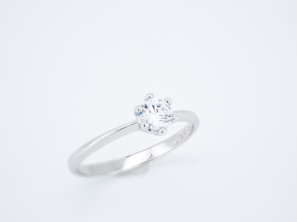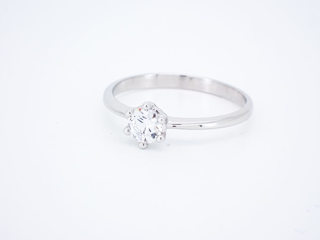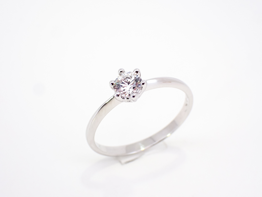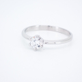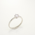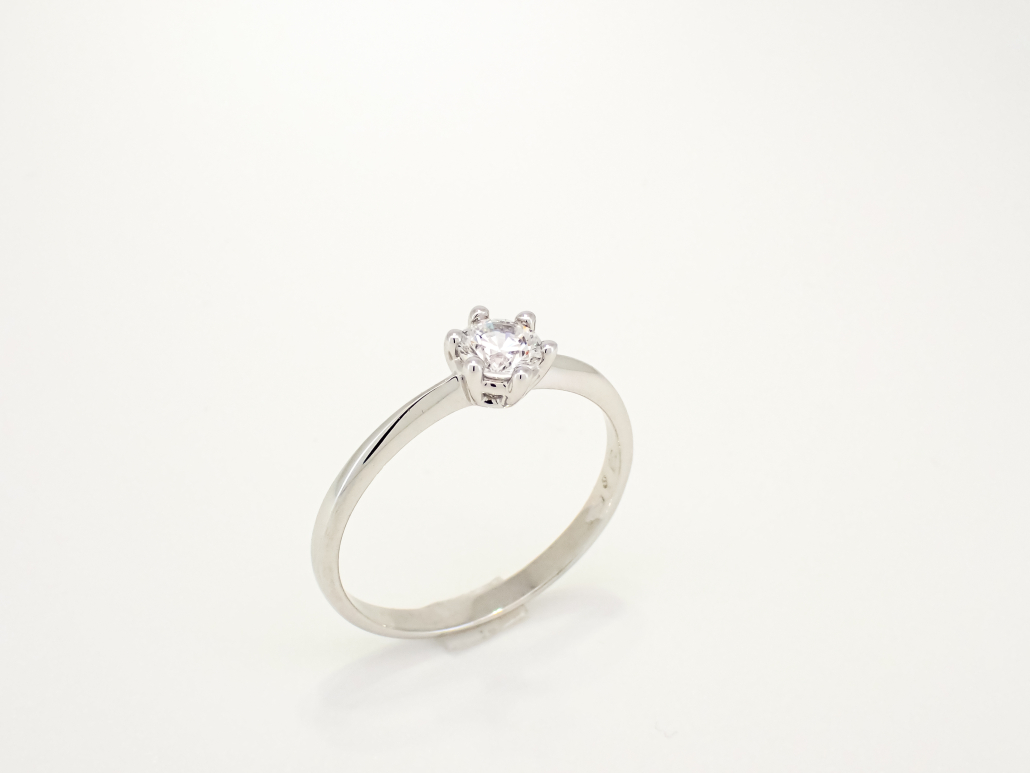 Klasični ženski prstan iz belega zlata s cirkonom v osrednjem delu.