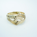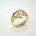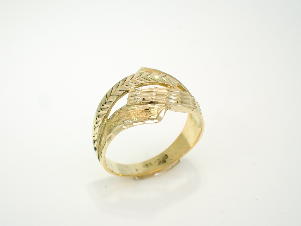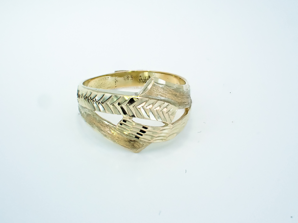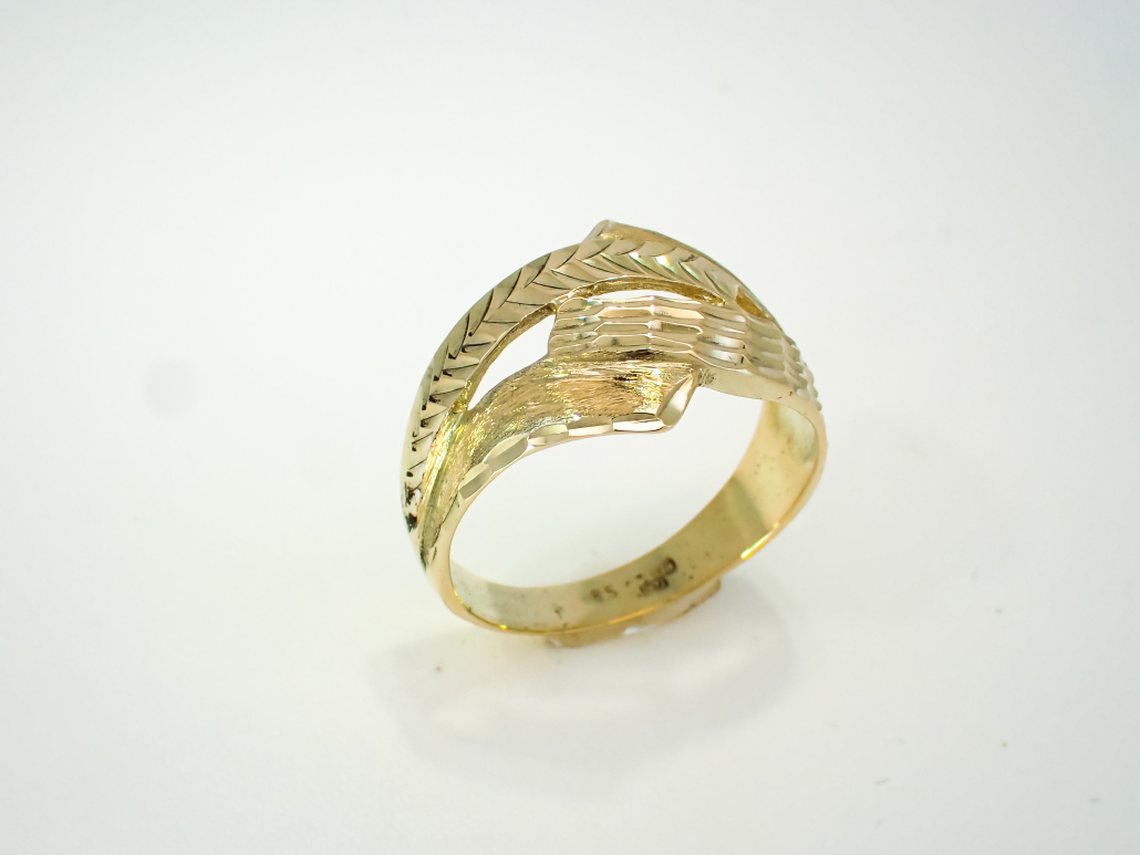 Ženski prstan iz rumenega zlata sestavljen iz navzkrižnih linij z okrasno gravuro, ki daje prstanu videz vkovanih kamnov.